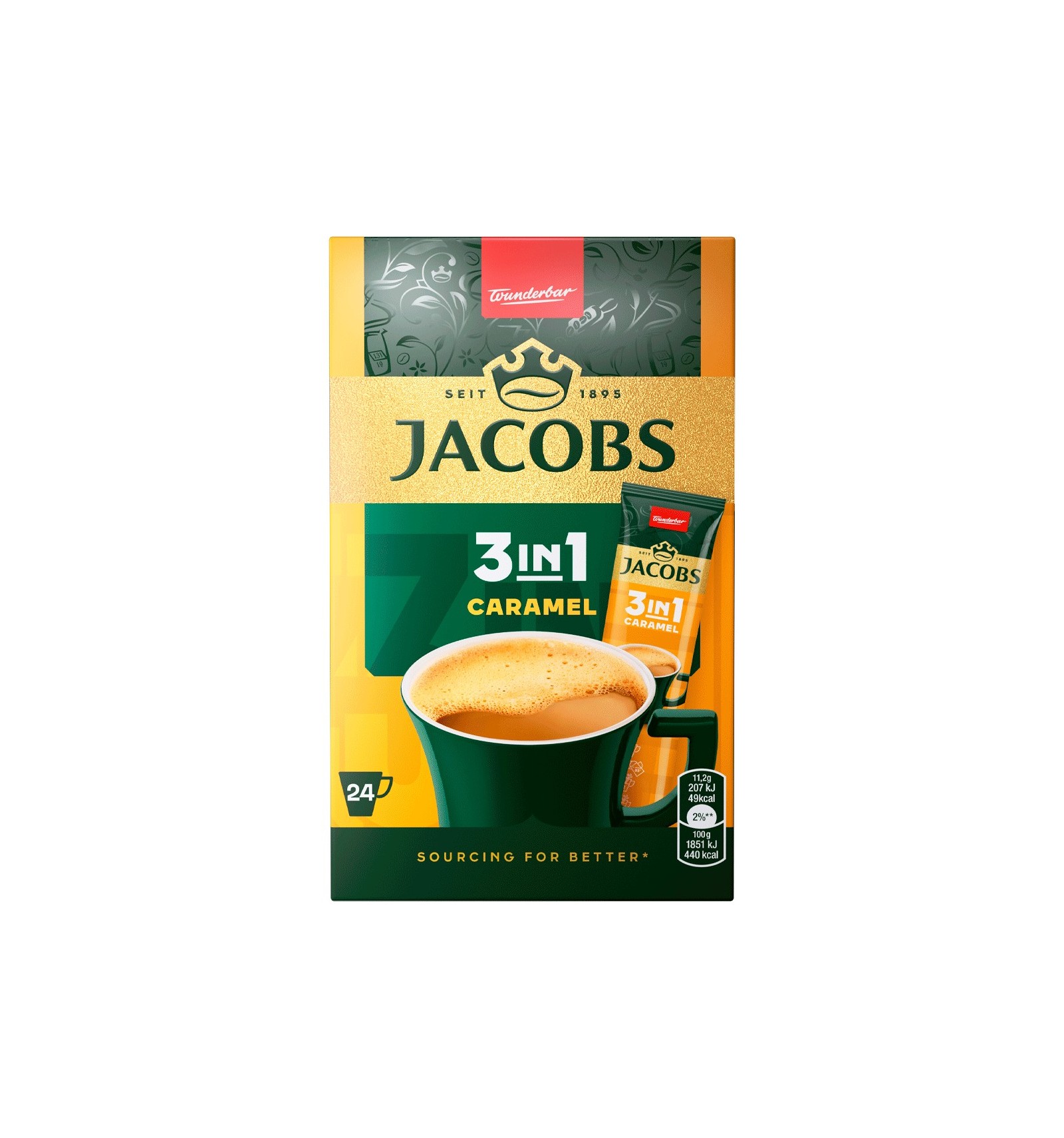 Ingredientes: Azúcar (60%), aceite vegetal de coco totalmente hidrogenado, jarabe de glucosa, café soluble (6.7%), aromas, estabilizantes (E340, E452), sal, emulsionantes (E471, E481), minerales de leche en polvo, proteína de leche, regulador de acidez (E500).