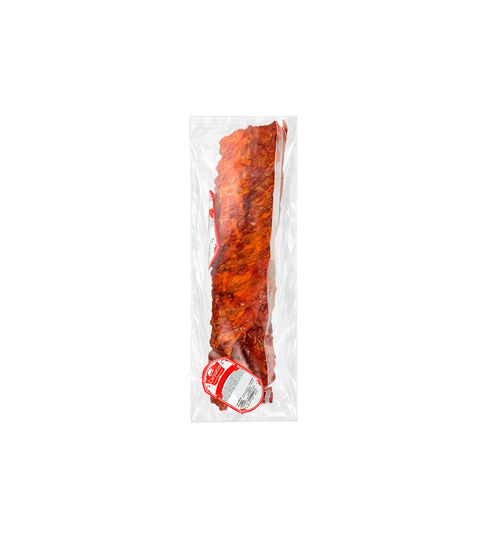 Ingredientes: costilla de cerdo (Origen: UE), sal y aromas (pimienta, sal, pimenton), conservante E250 (nitrito de sodio), colorante natural-norbixina.