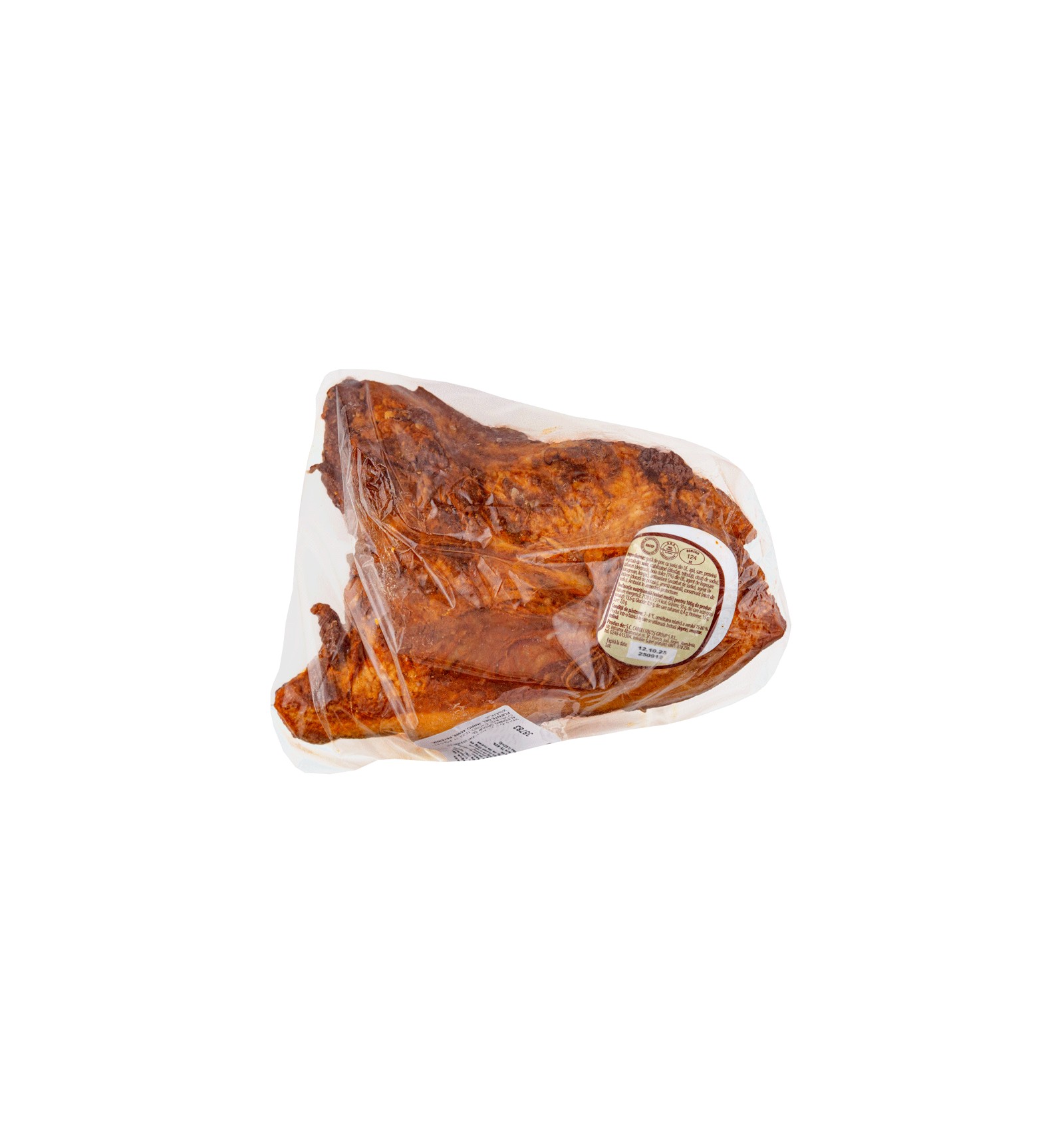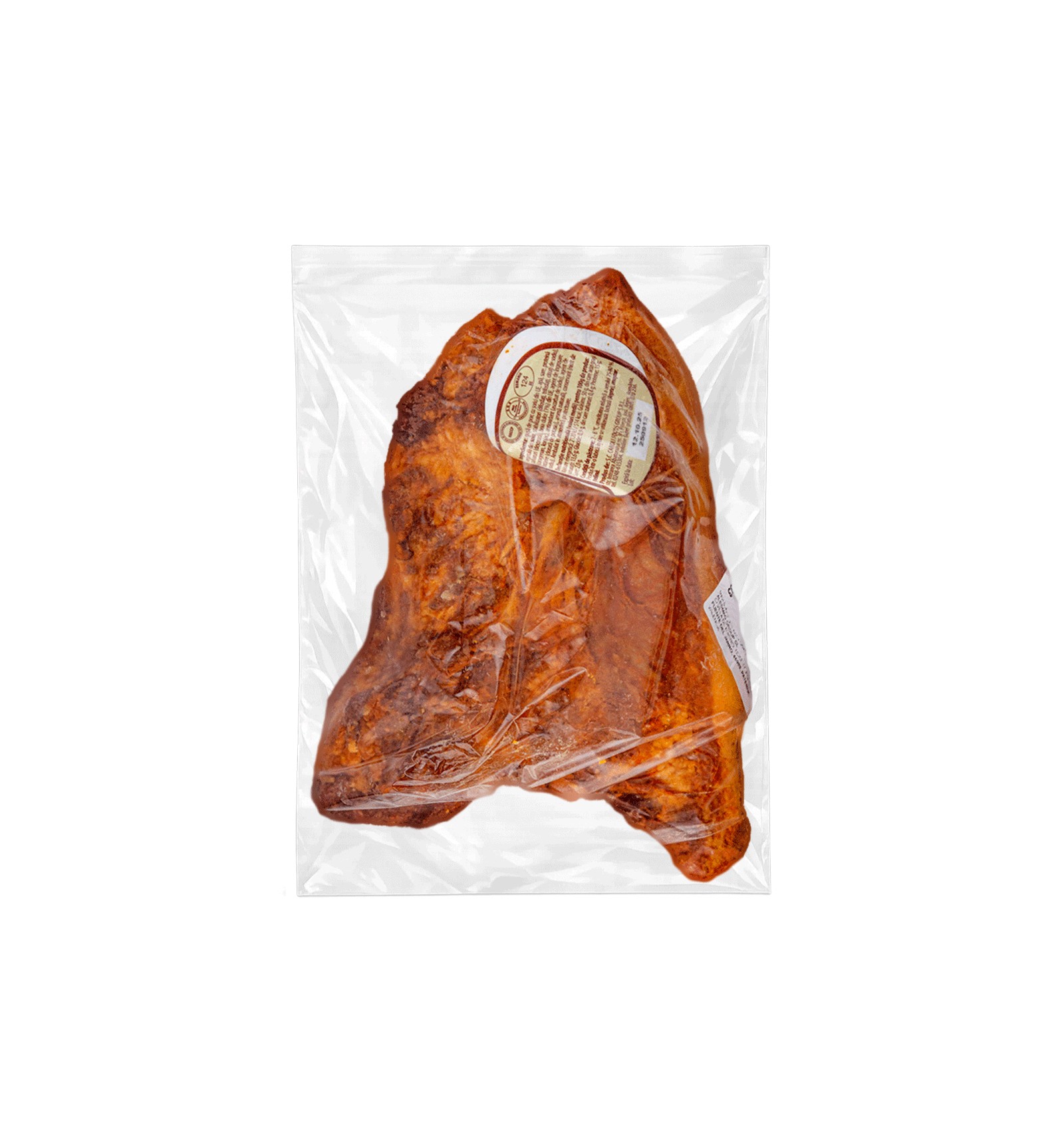 Ingredientes: papada de cerdo con corteza, agua, sal, proteína vegetal de soja, estabilizantes (difosfatos, trifosfatos, citratos de sodio), azúcares (dextrosa), pimentón dulce 1%, agente espesante (carragenina, konjac), antioxidante (ascorbato de sodio), agente de refuerzo (cloruro de potasio), aroma natural, conservante (nitrito de sodio). Puede contener trazas de: lactosa (leche), mostaza, apio.