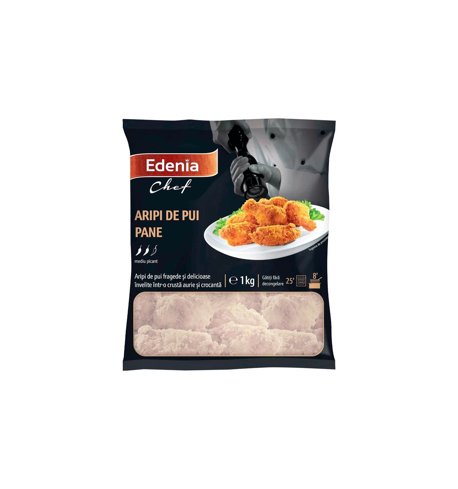 Ingredientes: Alitas de pollo 83%, harina de TRIGO, almidón (TRIGO, maíz, arroz), aceite de colza, sal, almidón modificado, especias, agentes de levadura (difosfatos, carbonato de sodio), extracto de levadura, glucosa, extracto de especias, verduras deshidratadas (APIO, ajo), colorante (extracto de pimentón). Alergenos: TRIGO, APIO.