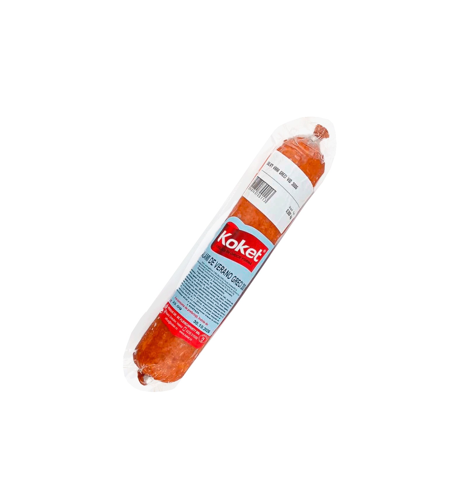 Ingredientes: carne de cerdo, tocino, proteína vegetal de SOJA, agua, sal, especias (ajo), estabilizador (trifosfatos de sodio), antioxidante (ácido ascórbico), potenciador de sabor (glutamato de sodio), fibra vegetal, lactato de sodio, azúcares (dextrosa, maltodextrina), aromas, conservadores (nitrito de sodio), colorante natural (carmín). Contiene SOJA y puede contener trazas de LACTOSA y MOSTAZA.
