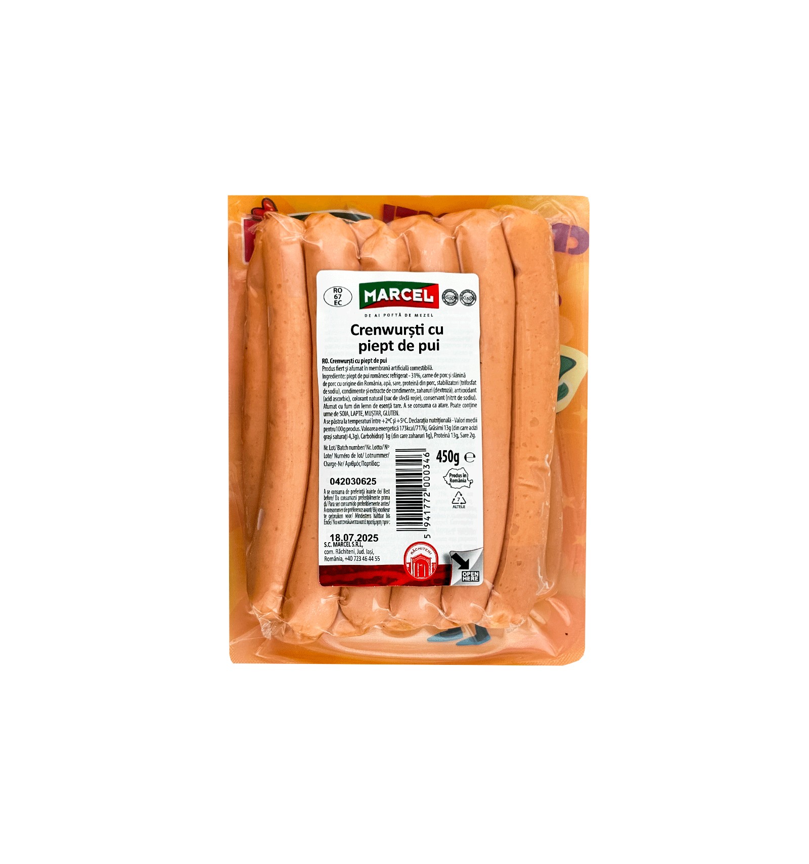 Ingredientes: pechuga de pollo - 32% (origen UE), tocino (origen UE), agua, tocino de cerdo (origen UE), proteína vegetal de SOJA, mezcla de condimentos [sal nitrificada (sal, conservante - nitrito de sodio), estabilizadores (difosfato de sodio, trifosfato de sodio), especias (pimentón dulce, pimienta, nuez moscada, ajo) y extractos de especias, azúcares (dextrosa), antioxidante (ácido ascórbico), potenciador del sabor (monoglutamato de sodio), aromas], colorante (carmín). Consumir tal cual. Ahumado con humo natural de madera dura. Puede contener trazas de mostaza, leche, gluten.