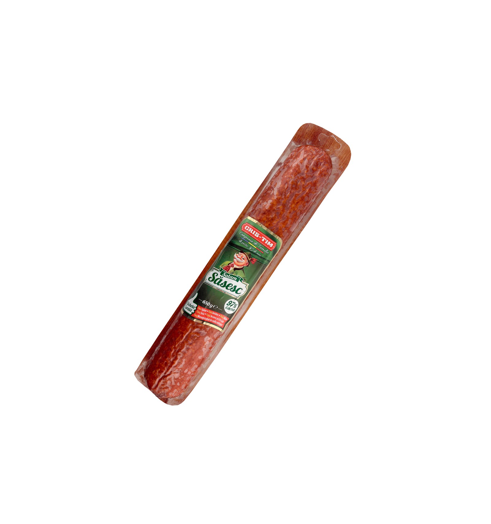Ingredientes: carne de cerdo (77%), carne de vaca (20%), agua, tocino, sal, corrector de acidez (glucono-delta-lactona), dextrosa, jarabe de glucosa, azúcar, aroma natural, extractos de especias, estabilizadores (trifosfatos), proteína de LECHE, antioxidante (ascorbato de sodio), colorante (carmín), conservante (nitrito de sodio). El producto puede contener trazas de: APIO, MOSTAZA, LACTOSA.