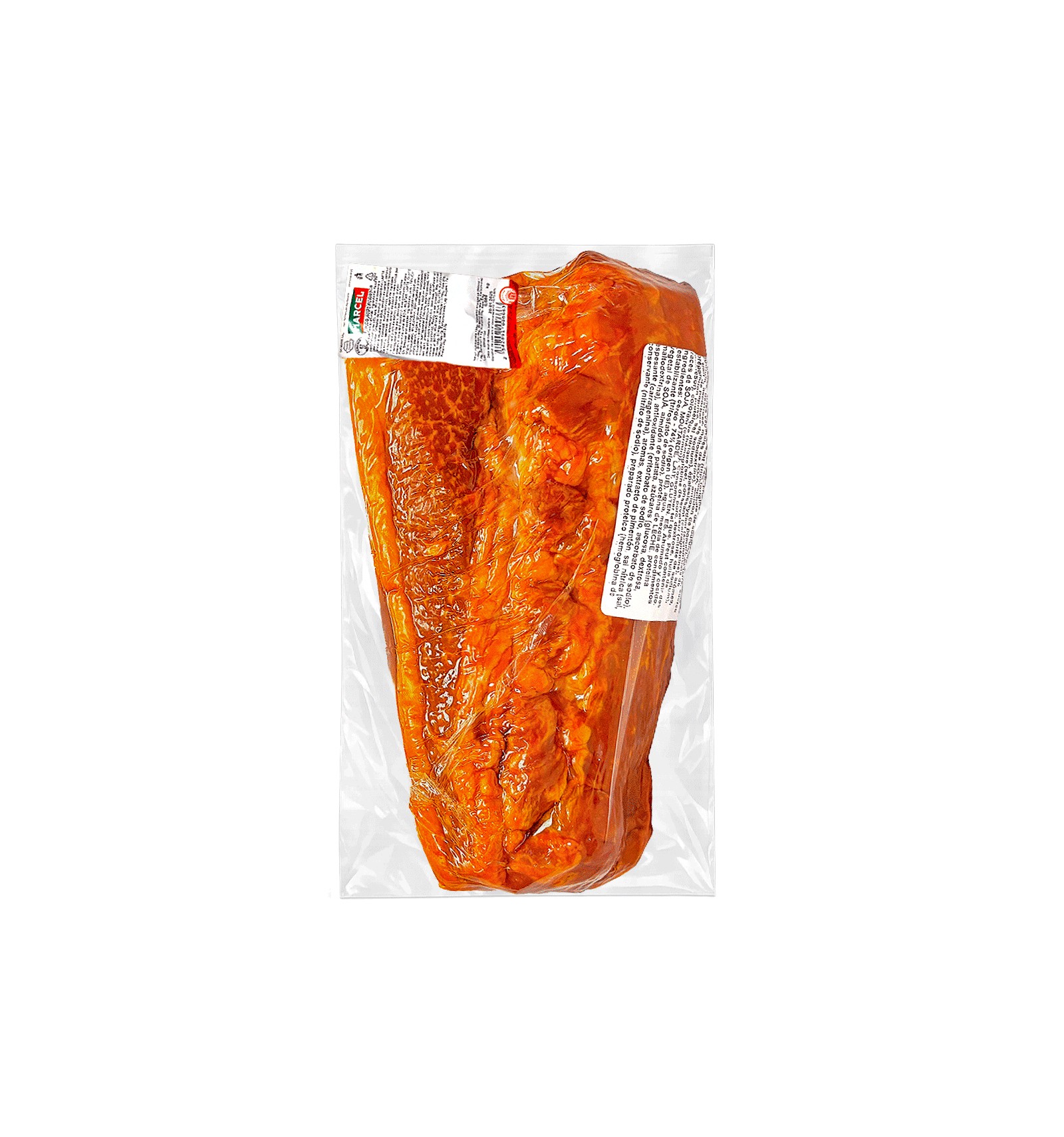 Ingredientes: panceta de cerdo 74% (origen UE), agua, mezcla de condimentos (estabilizador (trifosfato de sodio), proteína de leche, proteína vegetal de soja, almidón de patata, azúcares (glucosa, dextrosa, maltodextrina), antioxidante (eritorbato de sodio, ascorbato de sodio), agente espesante (carragenina), aromas, extracto de pimentón, sal, conservante (nitrito de sodio), preparado proteico (hemoglobina de cerdo, dextrosa, aceite de girasol), colorante (carmín). Puede contener trazas de soja, leche, mostaza, gluten.