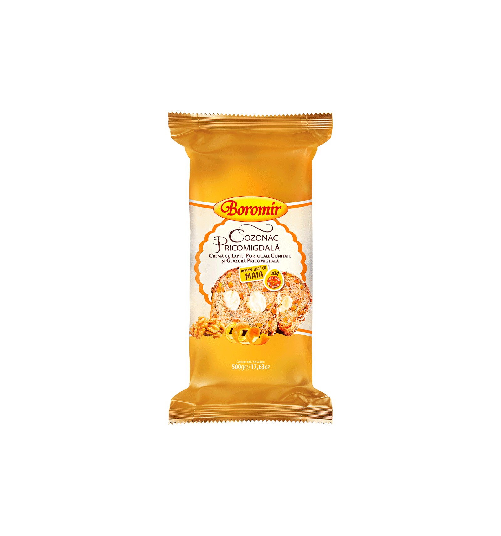 Ingredientes: harina blanca de TRIGO, crema con LECHE 20% (jarabe de glucosa, azúcar, agua, LECHE entera 10%, LECHE desnatada en polvo 5%, aceite vegetal de palma, aromas, nata 1%, estabilizante: pectina, conservante: sorbato de potasio, colorante: carbonato de calcio), glaseado pricomigdal 15% [azúcar, NUEZ 26%, clara de HUEVO de gallinas criadas en libertad 17%, aromas], cubitos de cáscara de naranja confitada 9,5% (cubitos de cáscara de naranja, jarabe de glucosa-fructosa, azúcar, regulador de acidez: ácido cítrico), masa madre/levadura natural 8% (harina blanca de TRIGO, agua), azúcar, MANTEQUILLA, HUEVOS de gallinas criadas en libertad 4%, yema de HUEVO de gallinas criadas en libertad 4%, agua, jarabe de azúcar invertido, aceites vegetales (palma, girasol, colza), emulgentes: mono y diglicéridos de ácidos grasos y lecitina de SOJA, LECHE en polvo entera, sal yodada, aromas. El producto puede contener trazas de otros frutos con cáscara dura.