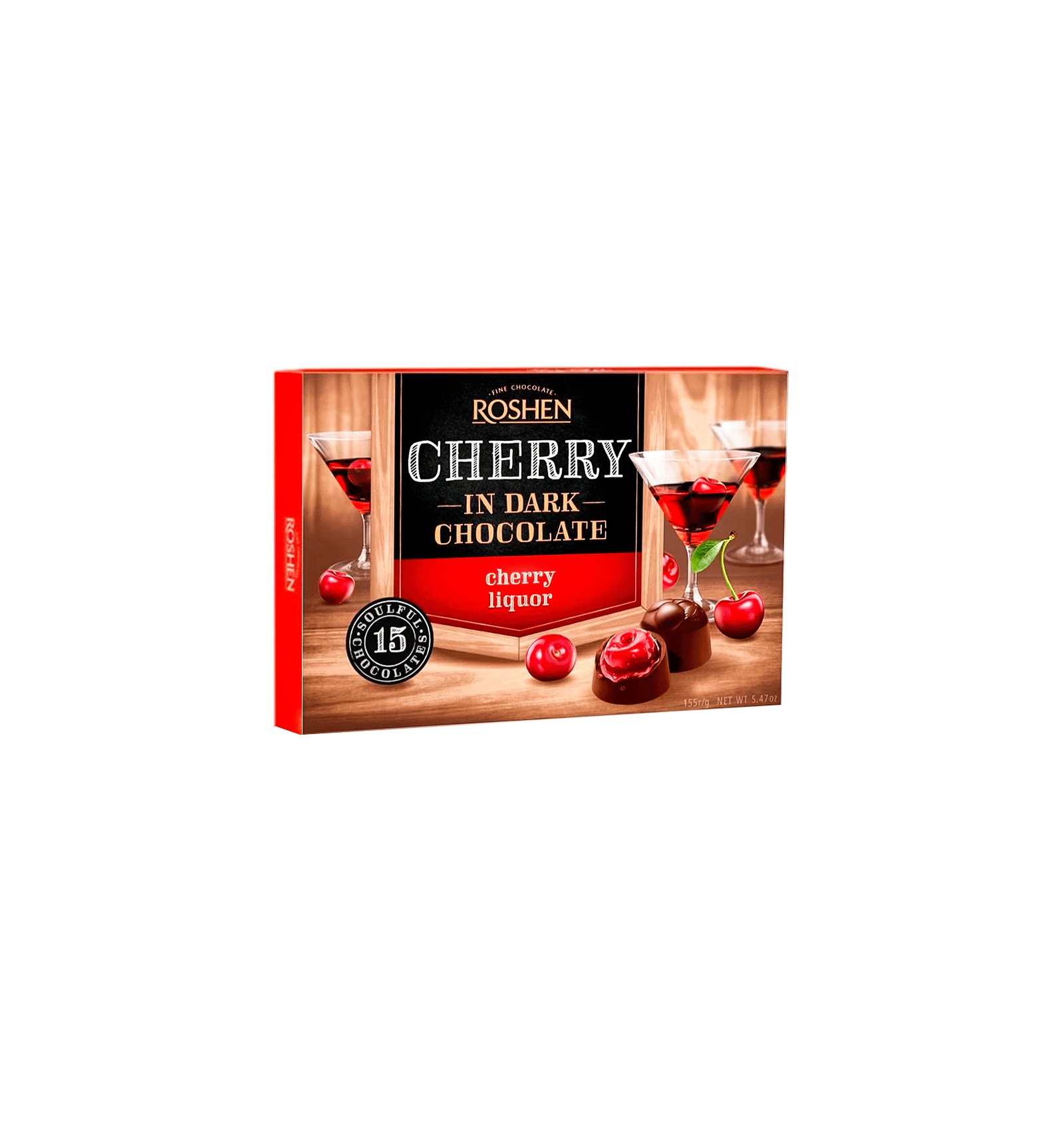 Ingredientes: Chocolate 60% [azúcar, pasta de cacao, manteca de cacao, aceite de karité, emulgentes (lecitina de soja, E476), aroma], cereza en licor de cereza 40% [azúcar, alcohol con cereza ácida 32% (guindas, alcohol, azúcar), jarabe de glucosa, alcohol etílico, colorantes (antocianina, betacaroteno), aroma]. Sólidos de cacao 48% mín. Contiene grasas vegetales además de manteca de cacao. Grado alcohólico 3,4%. Puede contener productos lácteos, avellanas, almendras, cacahuetes, semillas de sésamo, ovoproductos, gluten (trigo, cebada). Puede contener huesos de cerezas.