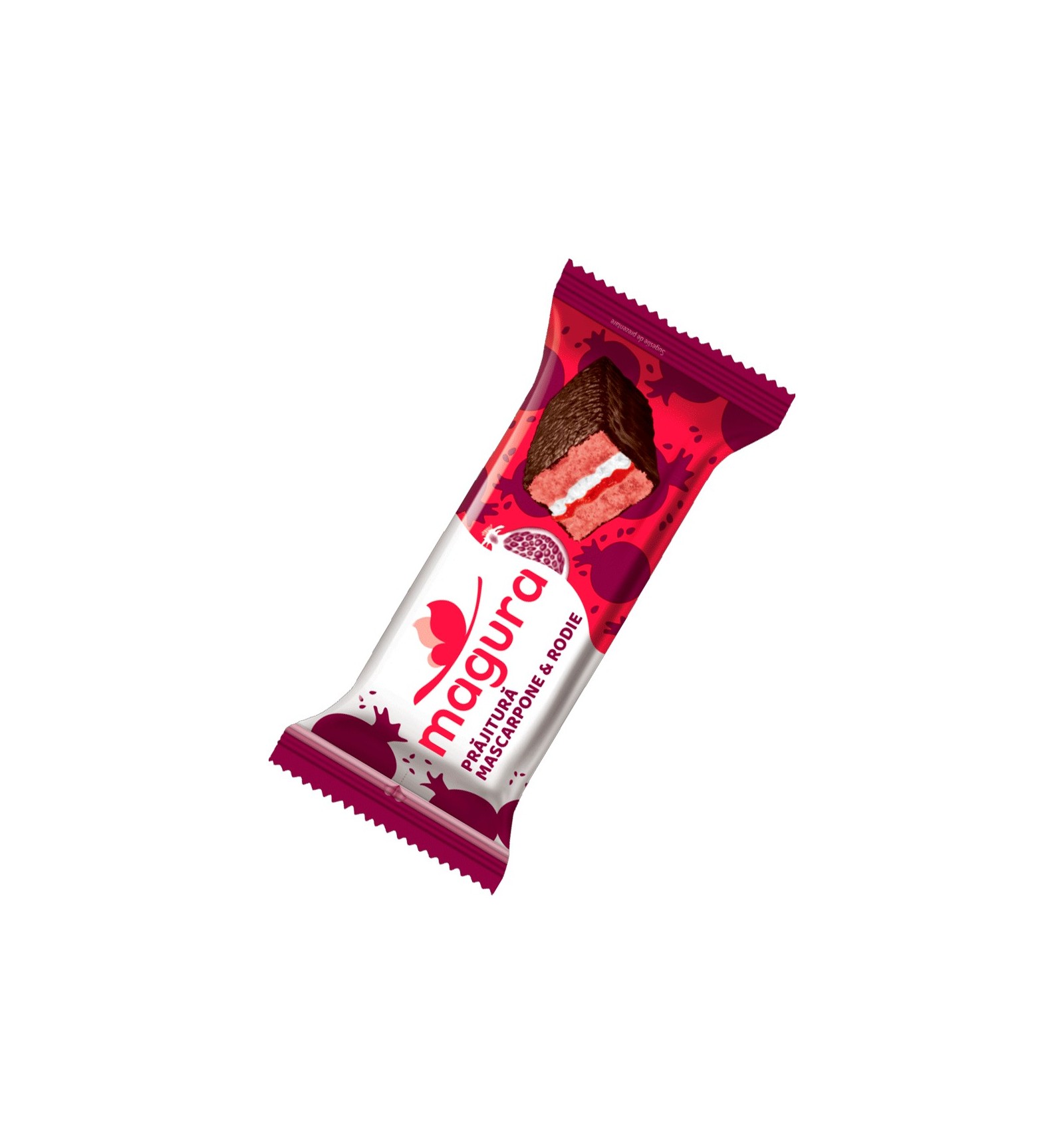 Ingredientes: azúcar, harina de trigo, relleno de granada 11% [sirop de glucosa-fructosa, azúcar, jugo de granada reconstituido a partir de concentrado (2,2%), puré de manzana, ácido (ácido cítrico), estabilizador (pectina), colorante (luteína), concentrado con rol colorante de zanahoria negra, regulador de acidez (citratos de sodio), aroma, conservante (sorbato de potasio)], grasas vegetales (aceite de karité, aceite de palma, aceite de palma parcialmente hidrogenado), sirop de glucosa, grasas vegetales (aceite de palma), cacao en polvo con bajo contenido de grasa (5,4%), huevos, sirop de glucosa-fructosa, agentes humectantes (sirop de sorbitol, glicerina), leche en polvo desnatada, alcohol etílico refinado de origen agrícola, agentes leudantes (pirofosfato disódico, bicarbonato de sodio), emulgentes (ésteres poliglicéridos de ácidos grasos, lecitina de soja, poliglicerol poliricinoleato), polvo de mascarpone 0,1% [queso (de leche), mascarpone (de leche), sal emulgente (citrato trisódico), colorante (carmin), aromas, sal, conservante (sorbato de potasio). Puede contener trazas de cacahuetes y frutos secos.
