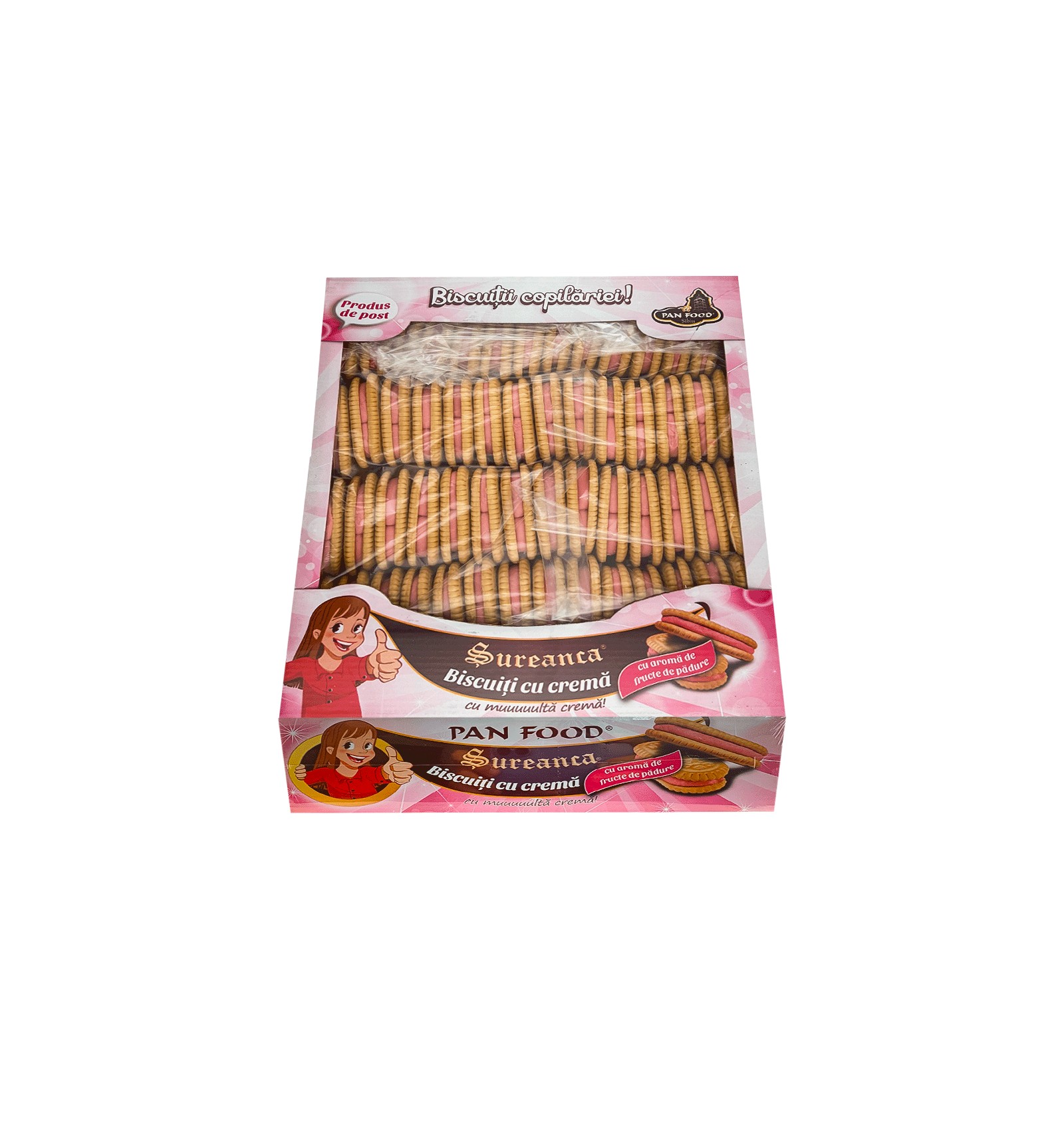 Ingredientes: harina blanca de trigo, azúcar, grasas vegetales no hidrogenadas de palma, dextrosa, emulsionante: lecitina de soja, jarabe de glucosa, acidulante: ácido cítrico, aroma de frutos del bosque, sal, colorante rojo: carmín, agentes de levadura: bicarbonato de sodio, bicarbonato de amonio; conservante: sorbato de potasio.