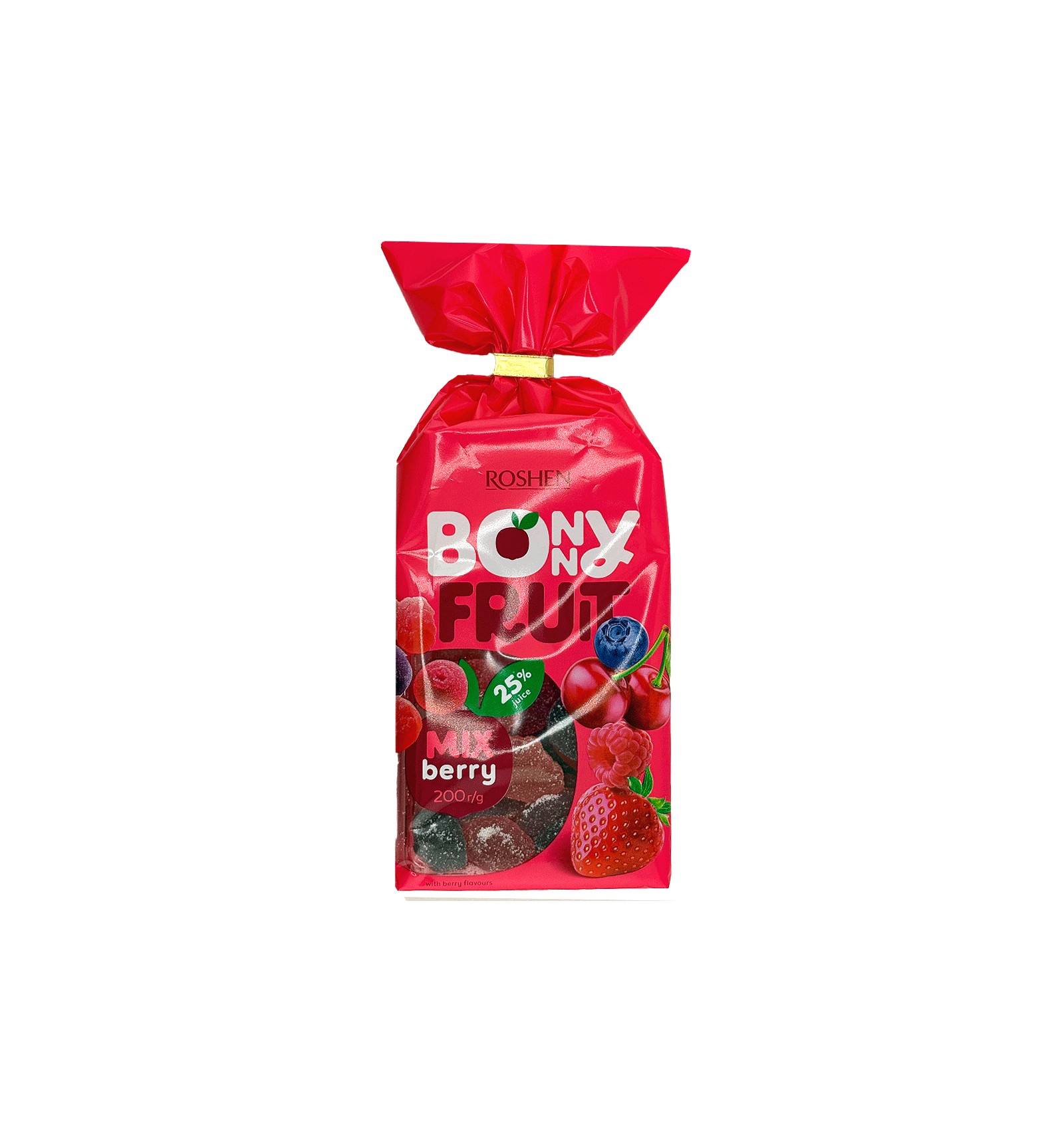 Ingredientes: azúcar, jarabe de glucosa, agua, zumo concentrado de frutas – 4% (zumos concentrados de frutas – 25% zumos de frutas = 1% zumo de frutas en el producto final: uvas, frutos del bosque, grosellas negras), gelatina, regulador de acidez (ácido cítrico, citrato trisódico), aroma natural de arándanos, aroma natural de grosellas, aroma natural de arándanos rojos, aroma natural de frambuesa, colorantes (antocianina, extracto de pimiento, betacaroteno, complejo colorante natural FCF). Puede contener: GLUTEN (TRIGO), productos de LECHE, SOJA, FRUTOS DE CÁSCARA, SÉSAMO.