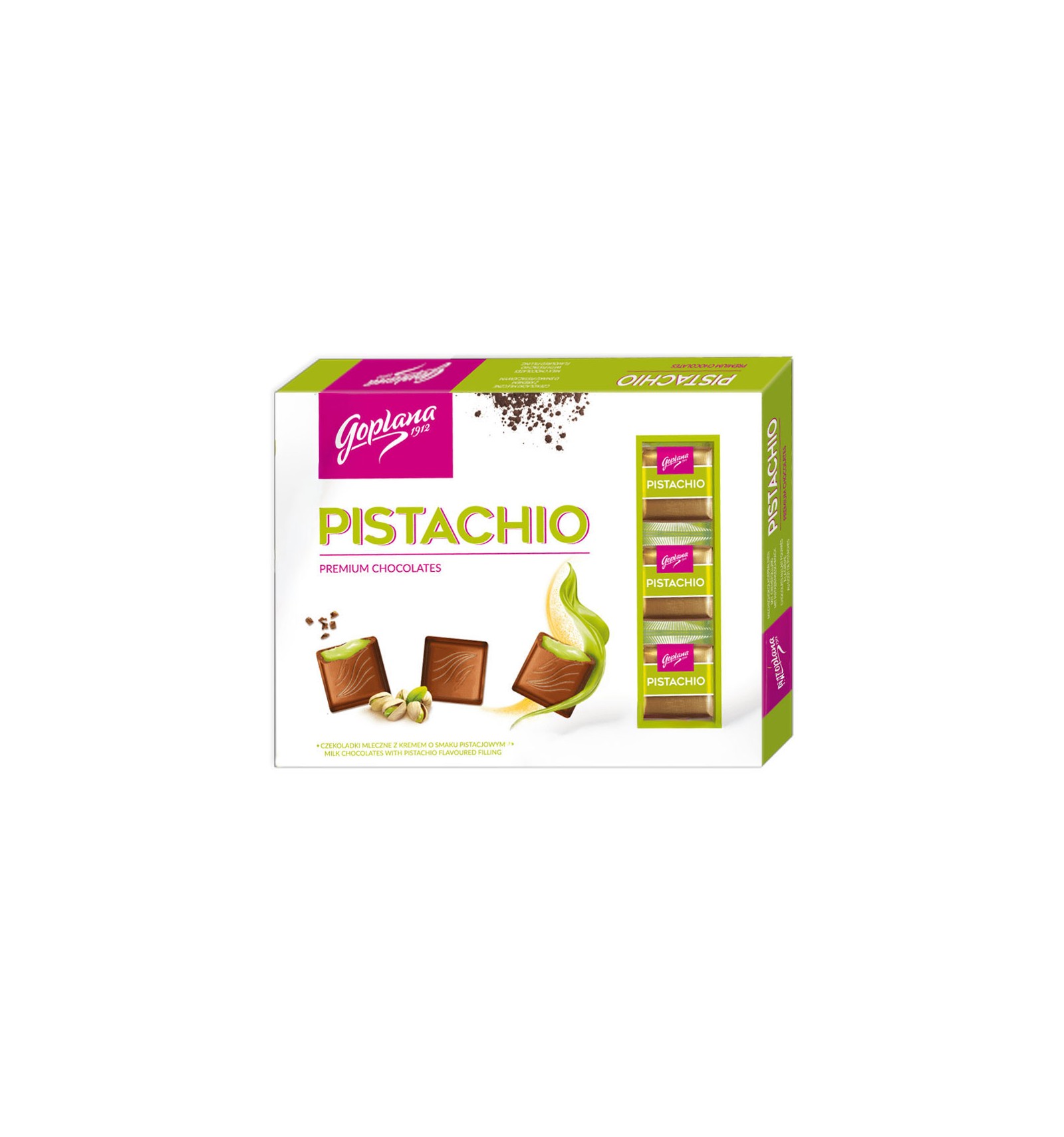 Ingredientes: azúcar, jarabe de glucosa, manteca de cacao, LECHE entera en polvo, suero de LECHE en polvo, grasa de palma, pasta de cacao, alcohol, LECHE desnatada en polvo, grasa de LECHE, PISTACHOS 0.1%, humectante: invertasa, emulgentes: lecitinas de SOJA, E476, aromas, concentrado de espirulina y manzana, colorante: curcumina. Producto puede contener HUEVOS, otros NUECES y CACAHUTES.