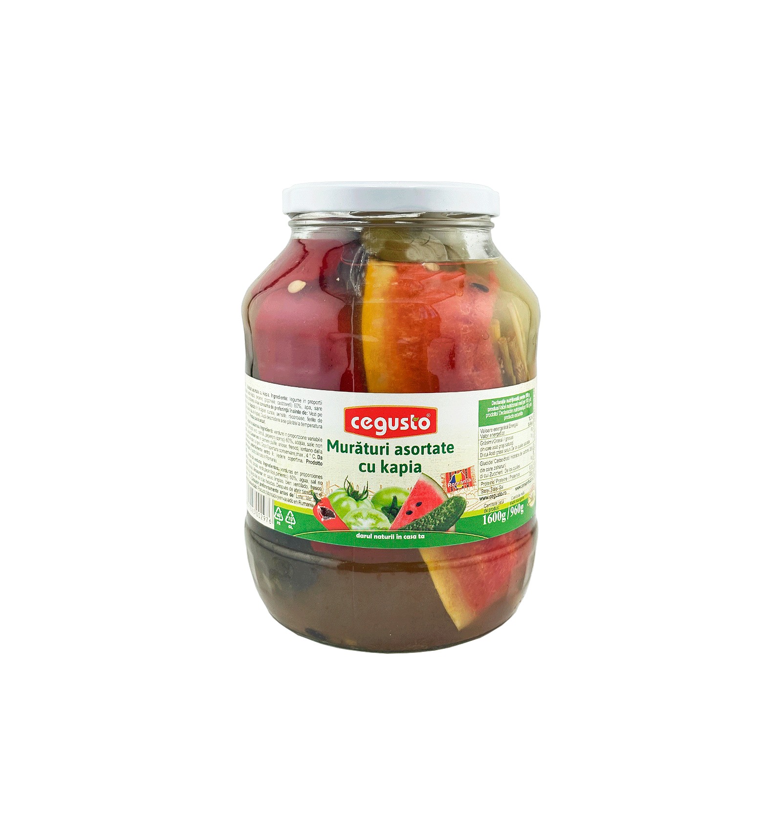 Ingredientes: verduras en proporciones variables ( melón, tomate verde, pepinillos, pimiento) 605, agua, sal no yodada, especias.