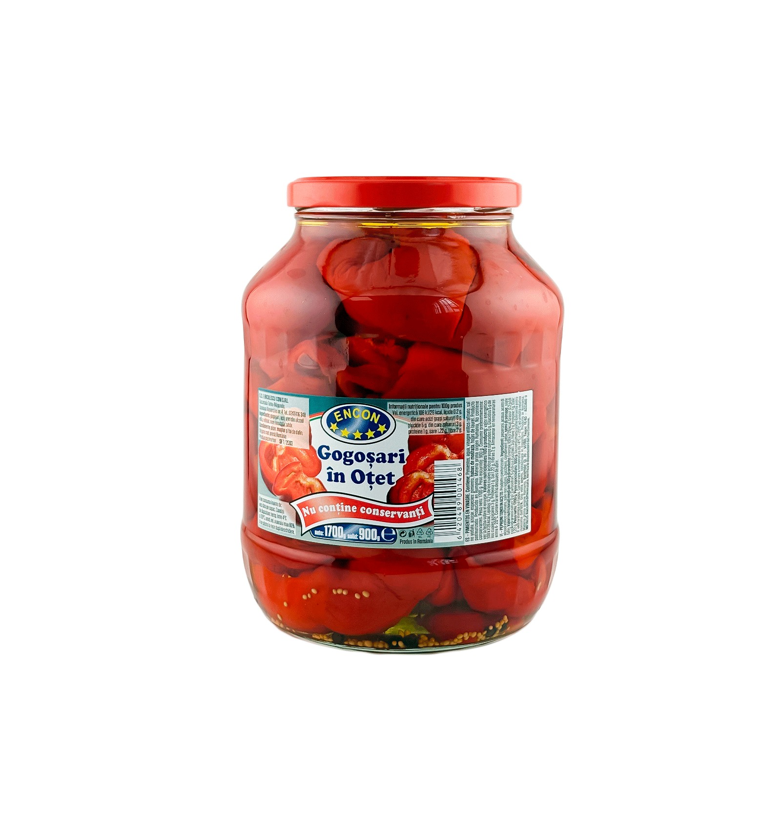 Ingredientes: pimientos, agua, vinagre etilico rafinato, sal no yodata, azúcar, especies: pimiento, habas de mostaza, hojas de laurel.