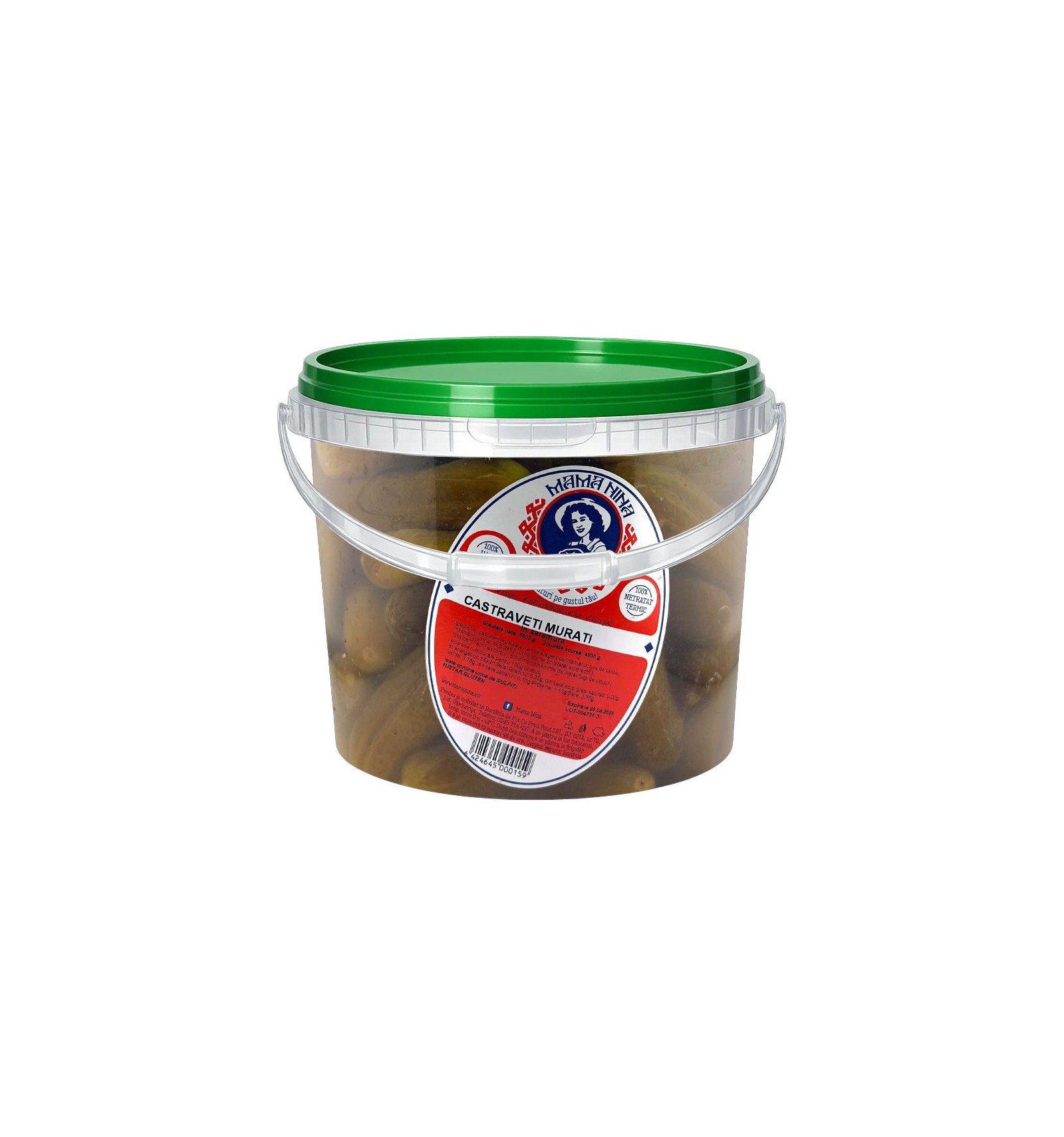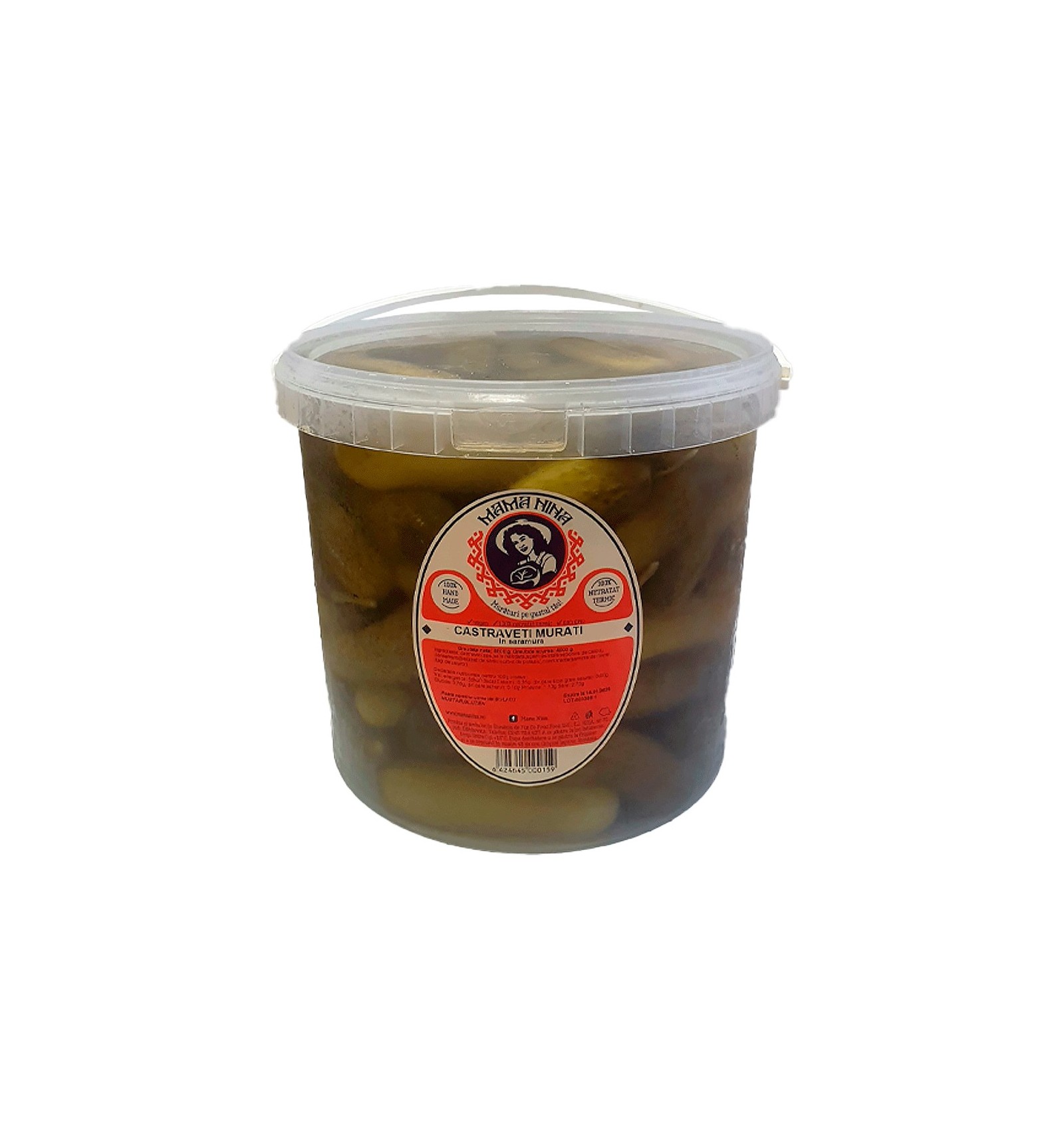 Ingredientes: pepinos, agua, sal no yodada, agente endurecedor (cloruro de calcio), conservantes (benzoato de sodio, sorbato de potasio), especias (semillas de eneldo, copos de ajo). Puede contener trazas de: mostaza, sulfitos, gluten.