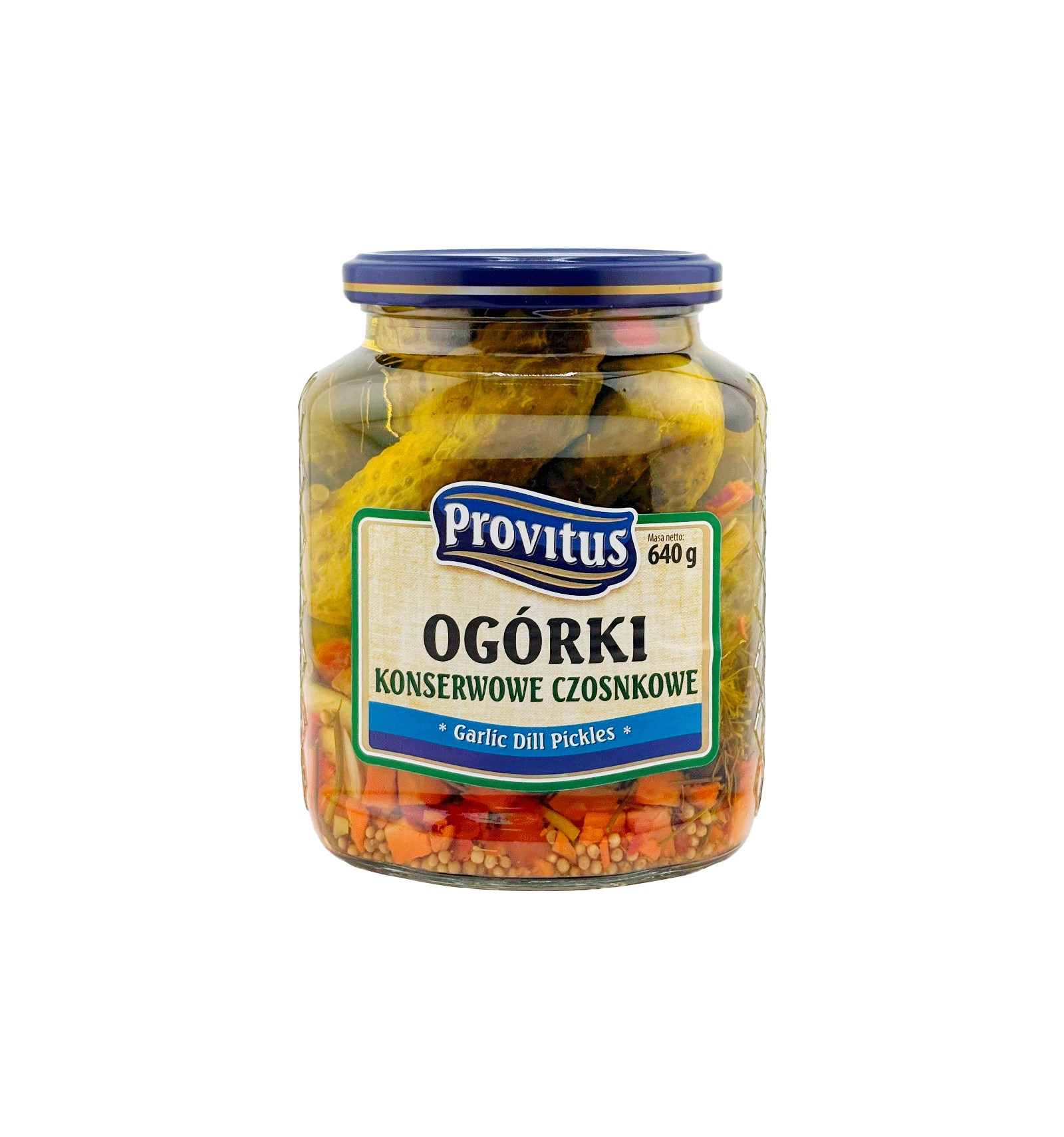 Ingredientes: pepinillos (48 %), agua, vinagre de alcohol, azúcar, eneldo, ajo (1,5 %), sal, verduras (cebolla, zanahoria, pimiento), MOSTAZA, mezcla de especias, colorante – riboflavina.