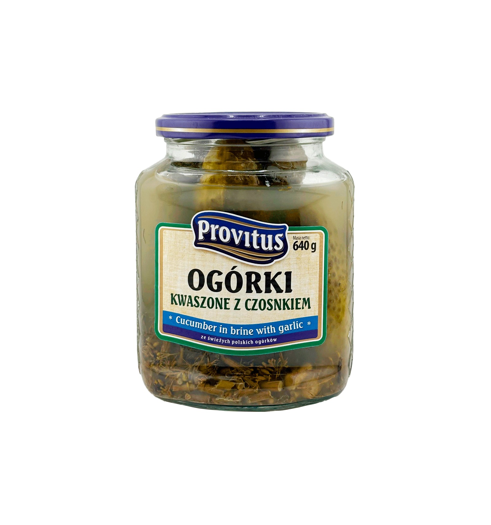 Ingredientes: pepinillos fermentados (50 %) (pepinillos, agua, sal, mezcla de especias), ajo (1,8 %), eneldo, ácido láctico (regulador de acidez), MOSTAZA blanca, mezcla de especias.