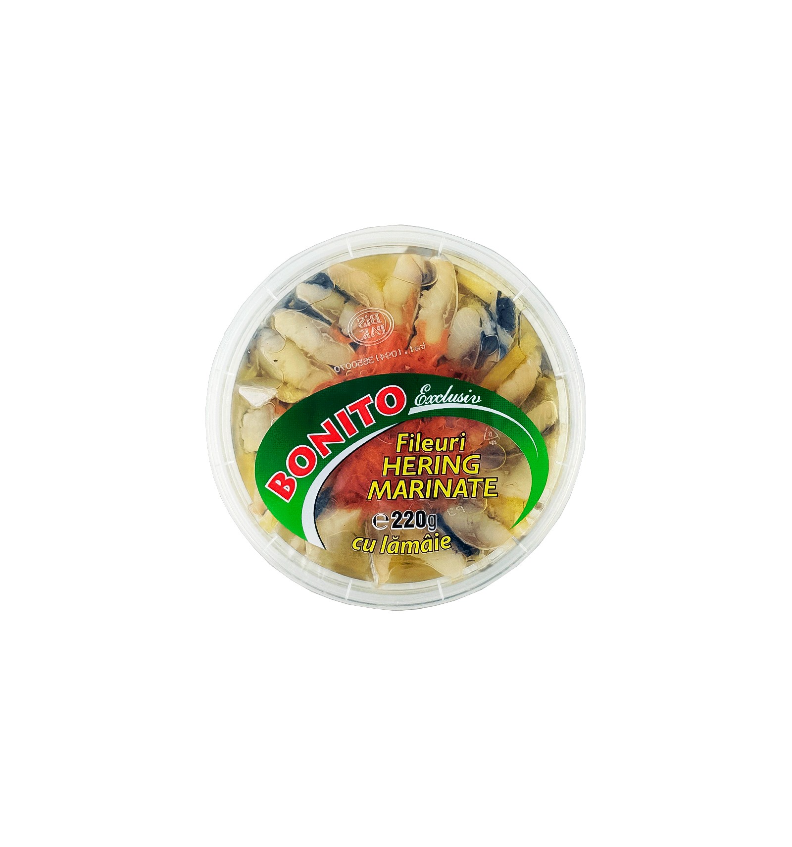 Ingredientes: filete de ARENQUE marinado 68% (ARENQUE - Clupea harengus, agua, acidulante: ácido acético, sal, azúcar, conservantes (sorbato de potasio, benzoato de sodio), aceite vegetal de girasol, zanahoria marinada (zanahoria, agua, sal, ácido láctico, ácido cítrico), limón 4.5%, cilantro, aromas.