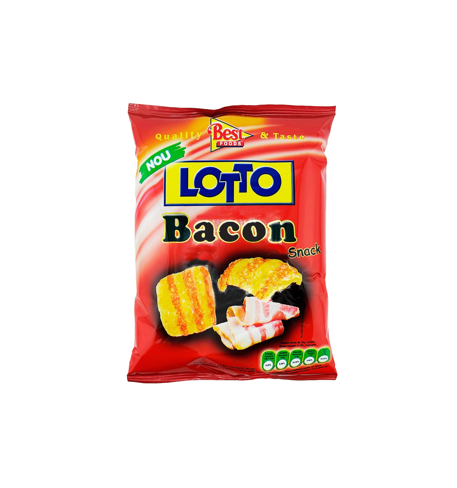 Ingredientes: harina de trigo (gluten), aceite vegetal (aceite de girasol), sabor a bacon 6.2% [aroma de bacon (lactosa, soja, altramuces, sulfitos), aroma de perrito caliente (cilantro, mostaza, sulfitos), aroma de champiñones (altramuces, sulfitos), aroma barbacoa (lactosa, soja, altramuces, sulfitos)], sal yodada 2.5%. Puede contener trazas de cacahuetes.