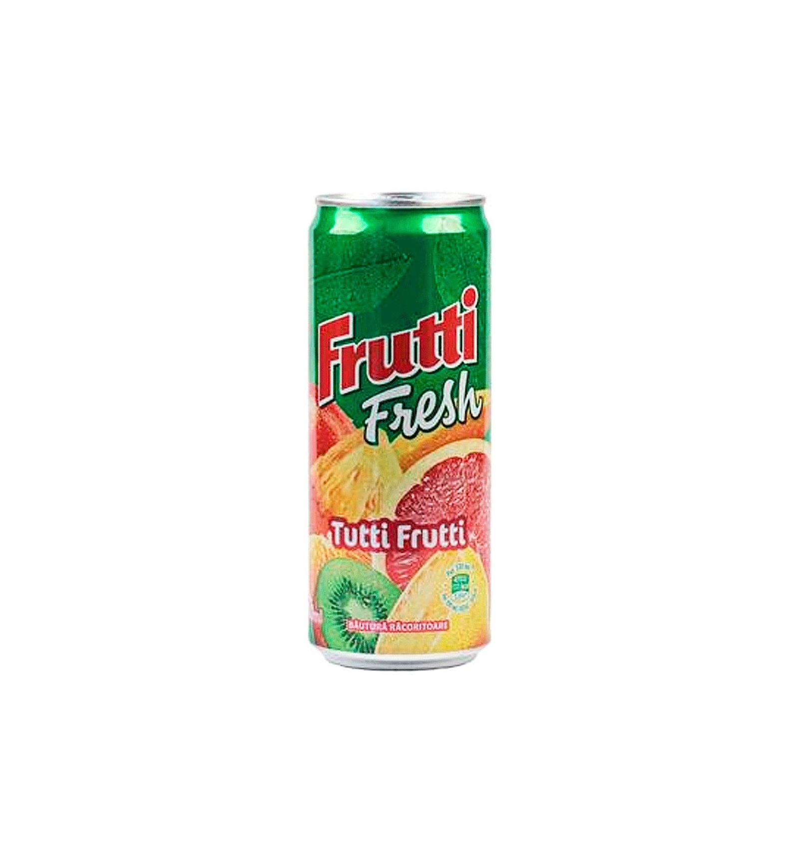 Ingrediente: apa, zahar, suc de fructe din suc concentrat 4% (mere, portocale, lamaie, kiwi, banane,struguri, ananas, piersici, grapefruit, mango), dioxid de carbon, acidifiant acid citric, stabilizatori polifosfat de sodiu, guma arabica si esteri ai rasinilor din lemn, acid ascorbic, arome,conservanti benzoat de sodiu si sorbat de potasio, colorant caroteni.