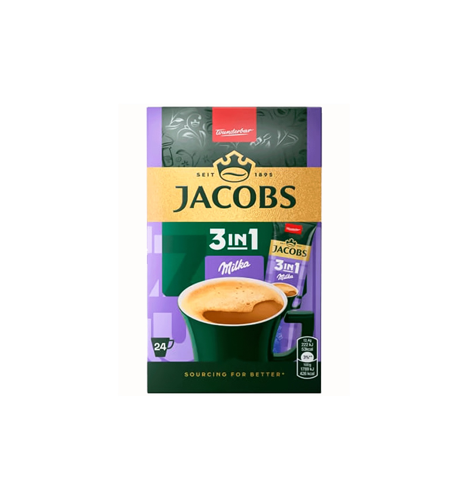 Ingrediente: Zahăr, sirop de glucoză, cacao (10%), ulei vegetal de cocos total hidrogenat, cafea solubilă (5.5%), stabilizatori (E340), (E452), proteină din lapte, sare, emulsifianți (E471, E481), agent antiaglomerant (E551). Alergeni: lapte și produse derivate (inclusiv lactoză).