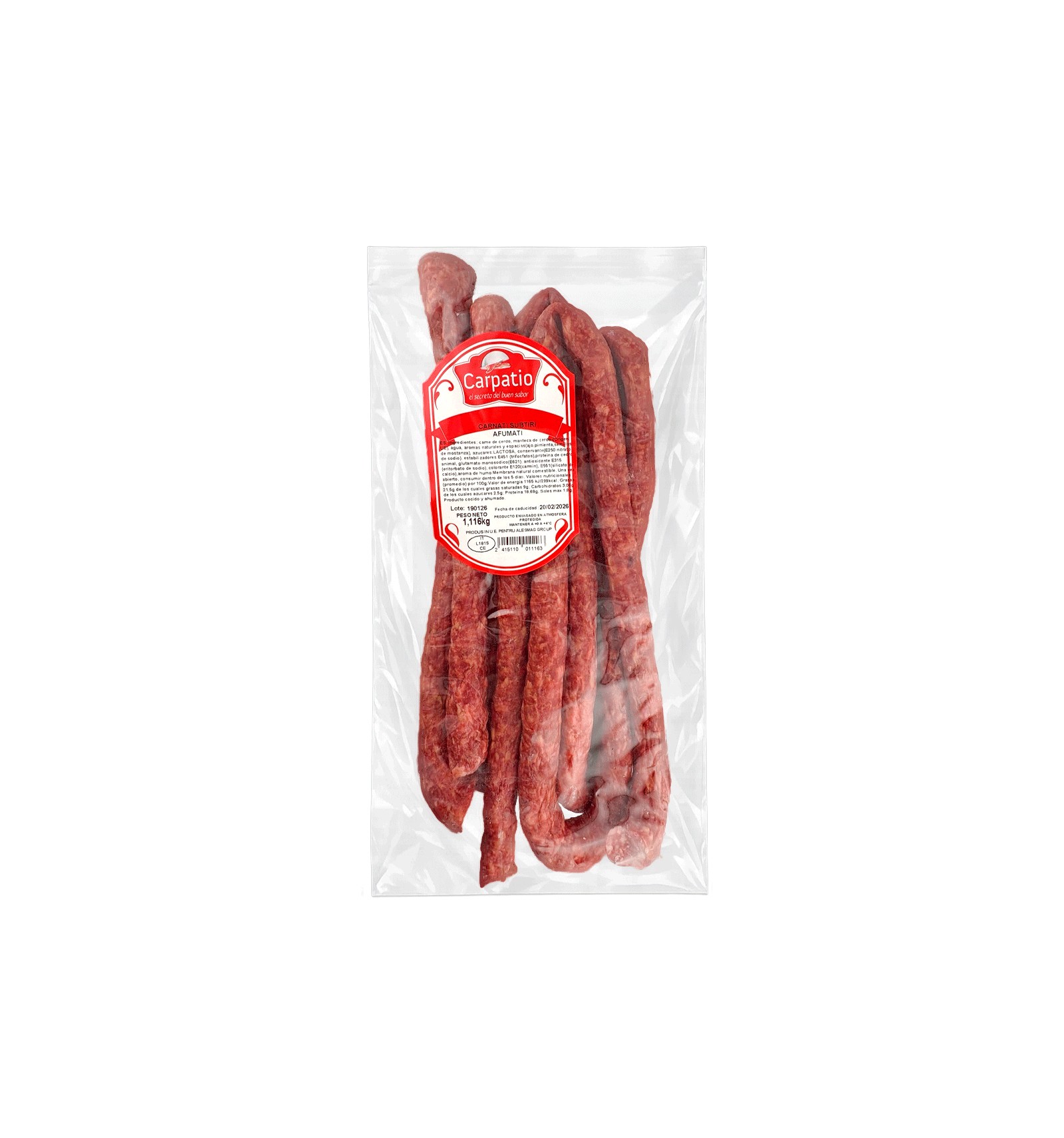Ingrediente: carne de porc, untură de porc (Origine: UE), apă, arome naturale și condimente (usturoi, piper, semințe de muștar), zaharuri: LACTOZĂ, conservant (E250 nitrat de sodiu), stabilizatori E451 (trifosfați), proteină de porc, glutamat monosodic (E621), antioxidant E315 (eritrobat de sodiu), colorant E120 (carmin), E551 (silicat de calciu), aromă de fum. Membrană naturală comestibilă.