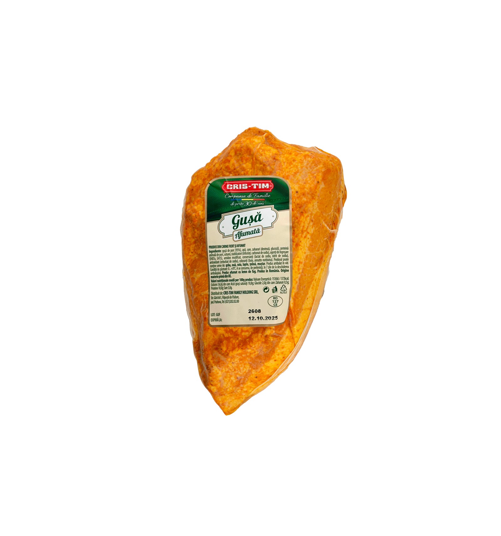 Ingrediente: gusa de porc 95%, apa, sare, zaharuri (dextroza, glucoza), proteína animala de porc, usturoi, stabilizatori (trifosfati de sodiu), agenti de ongrosare (E407a, E415), amidon modificat, conservanti (lactat de sodiu, nitrit de sodiu), antioxidant (eritorbat de sodiu), coloranti (boia, annatto norbixina). Porodusul poate sa contina urme de: grau, oua, soia, lapte, telina, mustar.