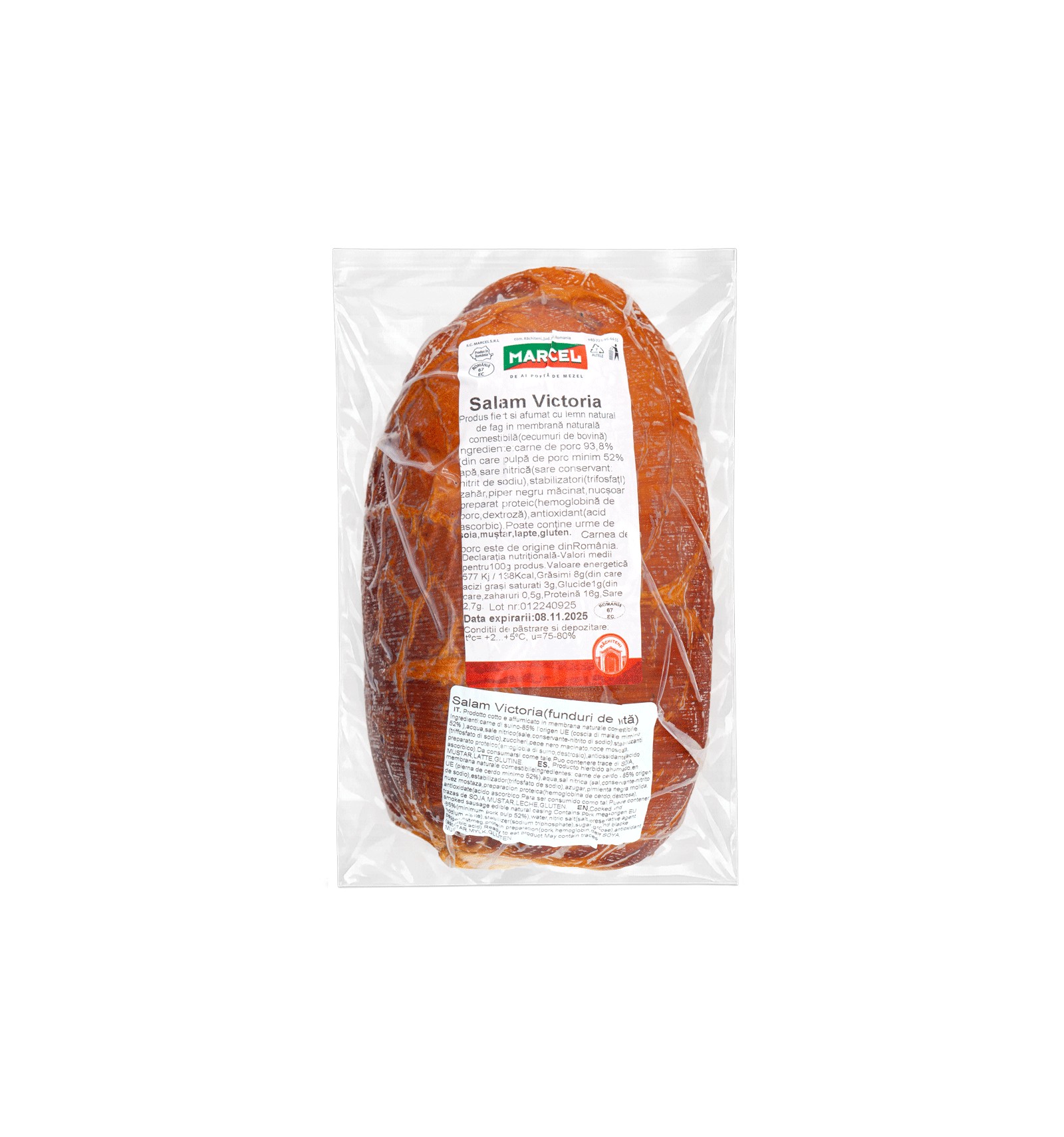 Ingrediente: carne de porc 93.8% (din carne pulpa de porc minim 52%), apa, sare nítrica (sare conservant, nitrit de sodiu), stabilizatori (trifosfati), zahar, piper negru macinat, antioxidant (acid ascorbic). Poate contine urme de soia, mustar, lapte, gluten.