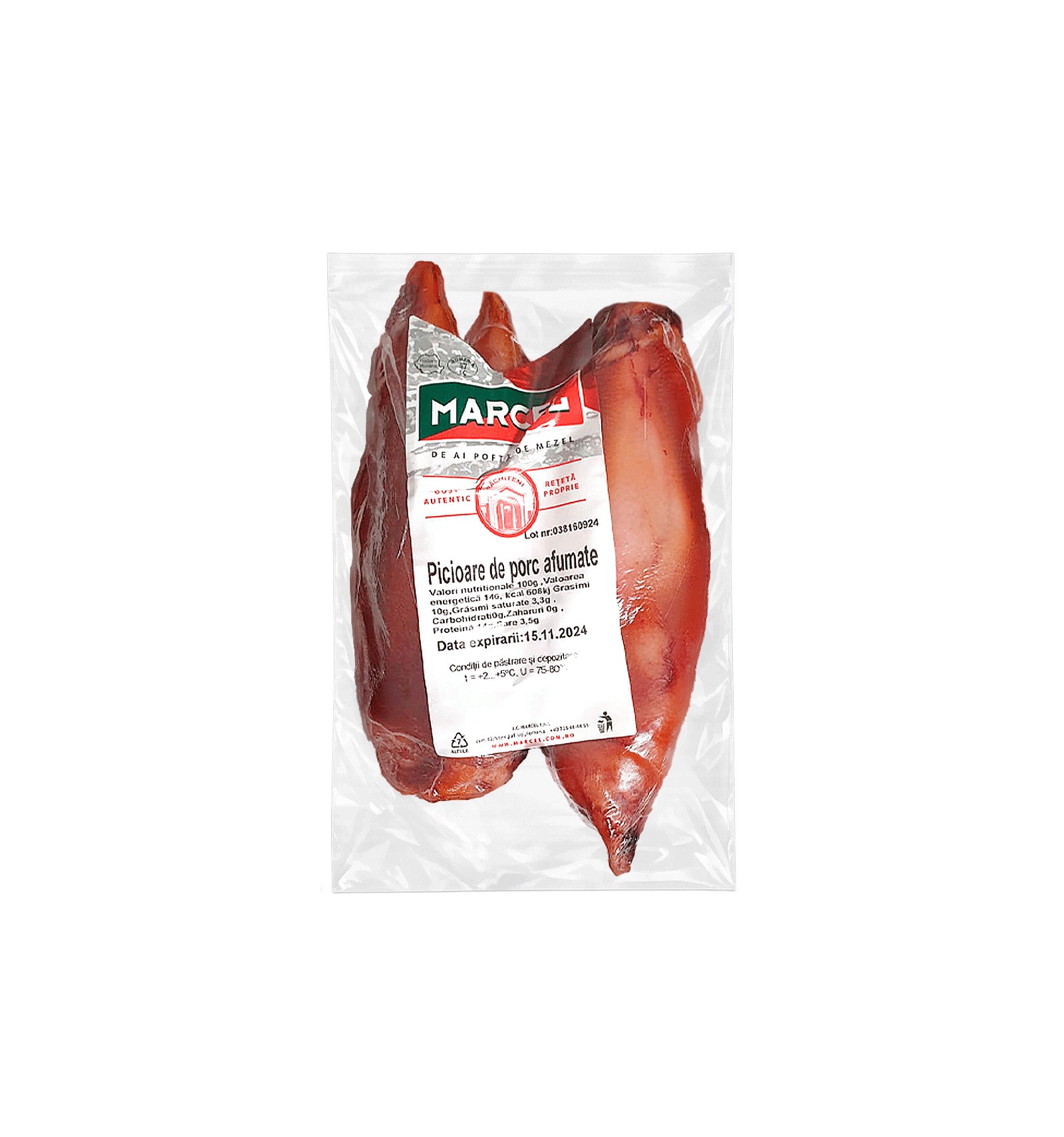 Ingrediente: picioare de porc 96.5% (origine UE), sare, conservant (nitrit de sodiu). Poate contine urme de soia, mustar, lapte, gluten.
