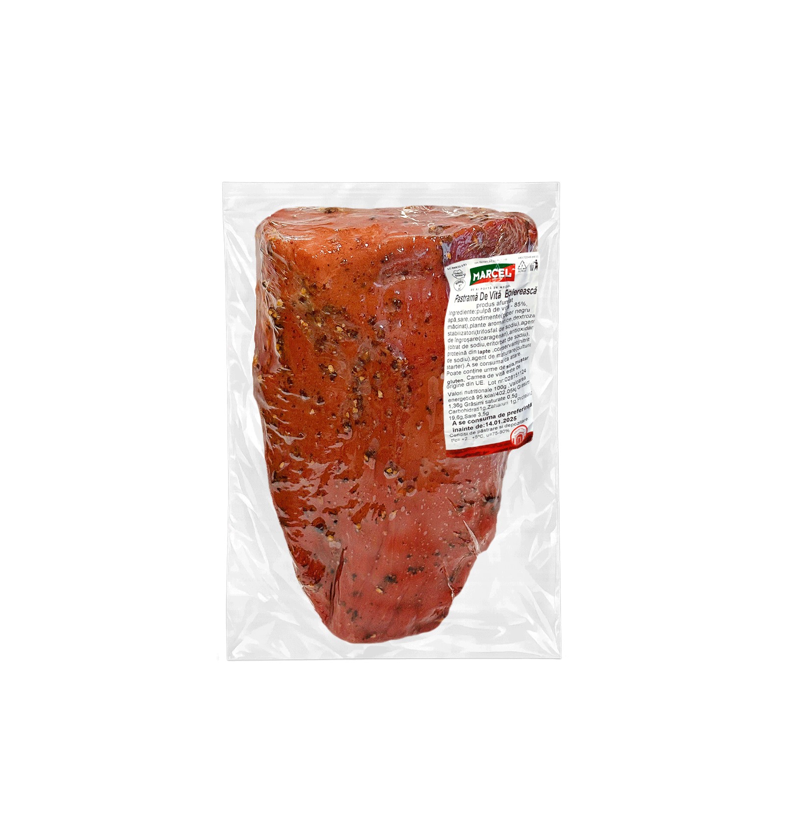 Ingrediente: pulpă de vită - 85%, apă, sare, condimente (piper negru măcinat), plante aromatice, dextroza, stabilizatori (trifosfat de sodiu), agent de îngroşare(caragenan) antioxidant (citrat de sodiu, eritorbat de sodiu), proteină din lapte, conservant(nitrit de sodiu) agent de maturare(cultura starter). Poate conține urme de soia, mustar gluten.