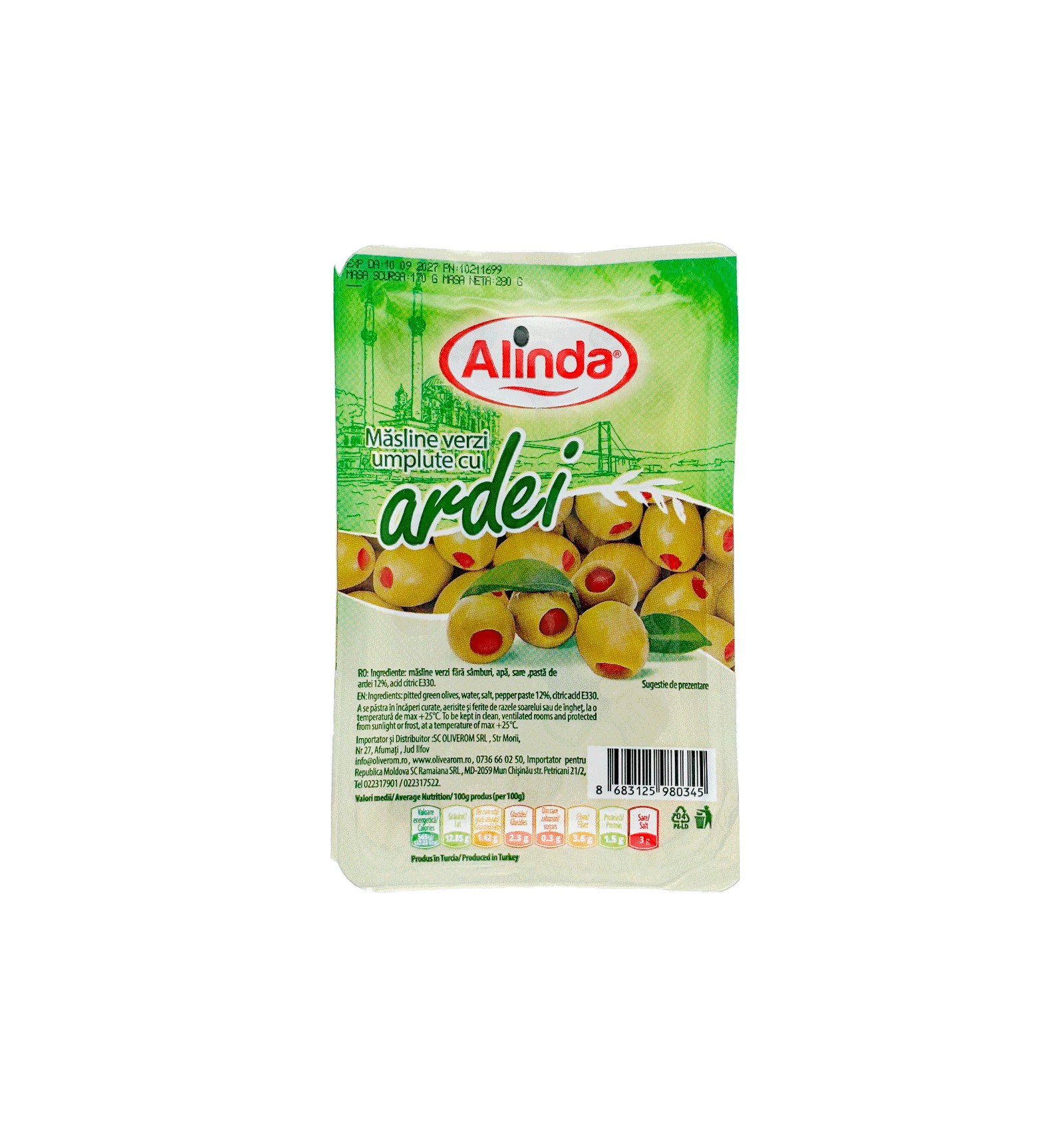 Ingrediente: măsline verzi fără sâmburi, apă, sare, pastă de ardei 12%, acid citric (E330).