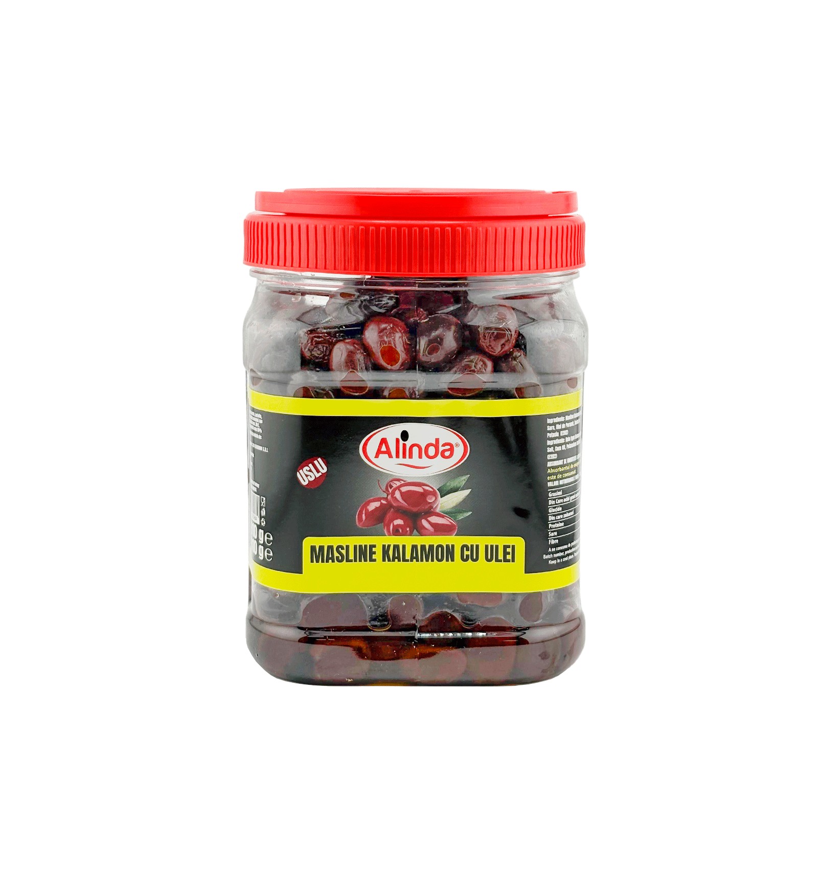 Ingrediente: măsline tip Kalamon Uslu, sare, ulei de porumb, sorbat de potasiu (E202).