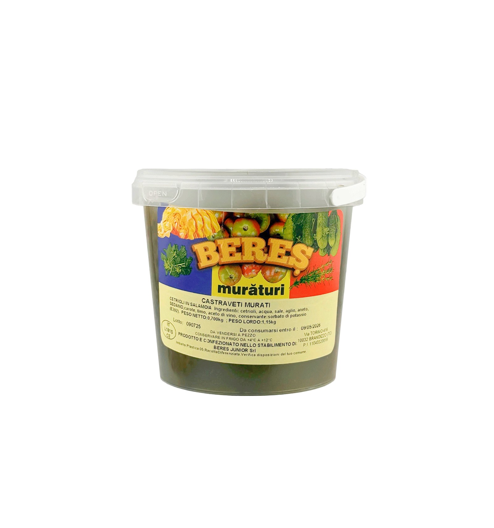 Ingrediente: Castraveți, apă, sare, usturoi, mărar, țelină, morcovi, cimbru, oțet de vin, conservant: sorbat de potasiu.