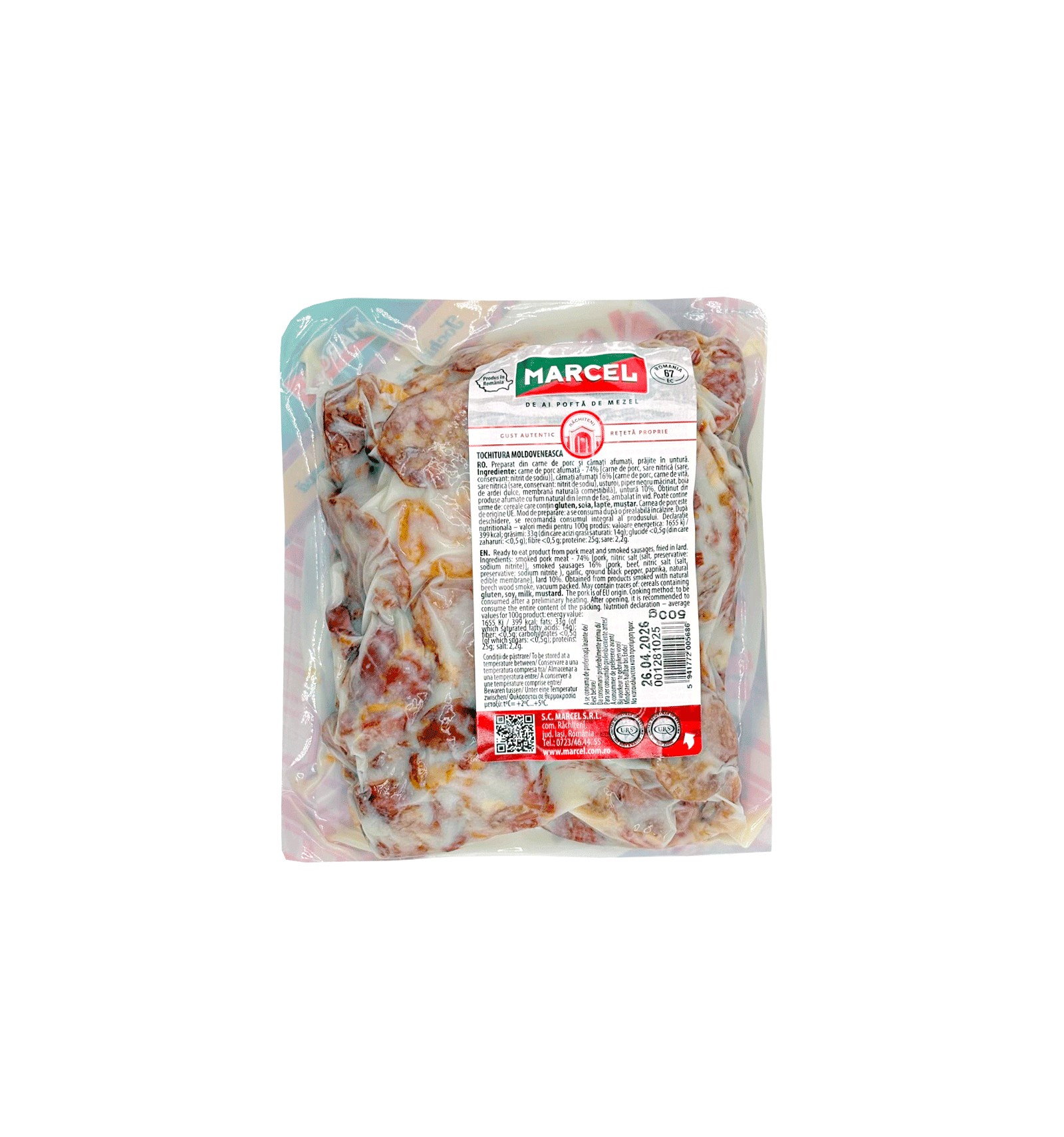Ingrediente: carne de porc 74% [carne de porc, sare nítrica (sare, conservant: nitrit de sodiu)], carnati afumati 16% [carne de porc, carne de vita, sare nítrica (sare, conservant: nitrit de sodiu), usturoi, piper negru macinat, boia de ardei dulce, membrana naturala comestibila], untura 10%. Poate conţine uşoare urme de: cereale care contin gluten, soia, lapte, mustar.