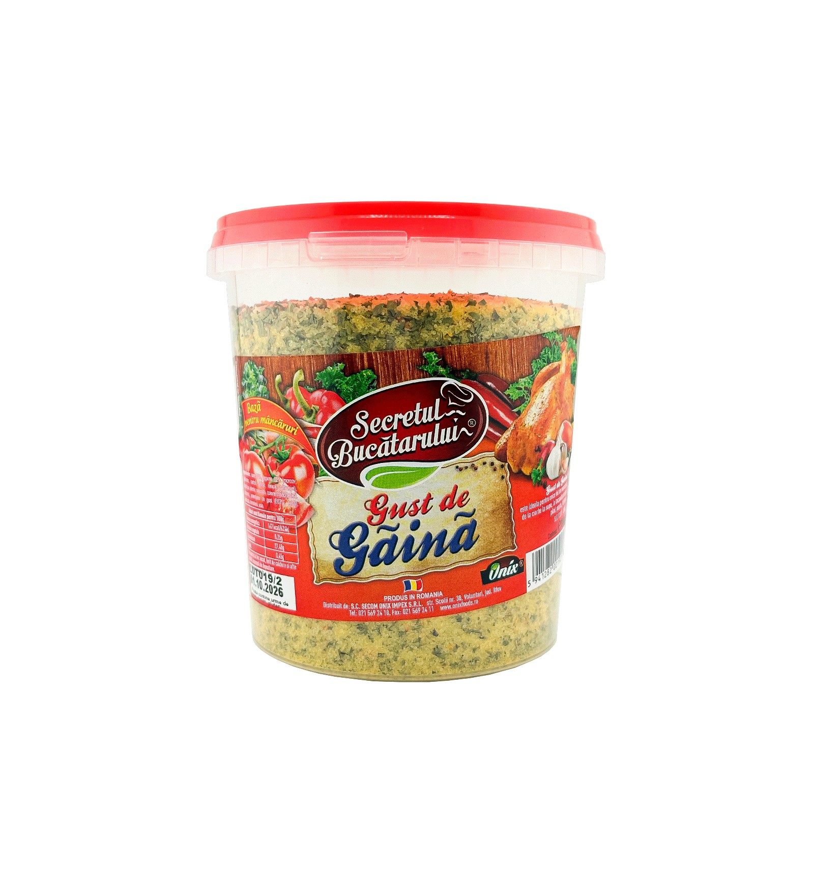 Ingrediente: sare 85%, legume 12% (morcov, pastarnac cartofi, telina, ceapa, patrunjel), aroma pui, colorant (riboflavina,curcuma), potentiator de gust (E621), zahar, dextroza, mirodenii, soia.
