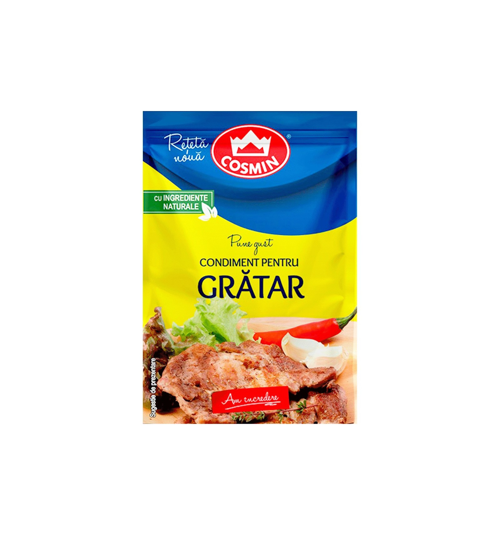 Ingrediente: condimente pentru grătar: sare 35%, boia dulce, ceapă, pătrunjel, curry (curcuma, chimion, coriandru, semințe de schinduf, pătrunjel, chilli, usturoi, fenicul, condimente), usturoi, chilli, piper negru, ghimbir, nucșoară, măghiran, verdețuri, condimente. Poate contine urme de: faina de grau, oua, soia, lapte, telina, mustar, susan.
