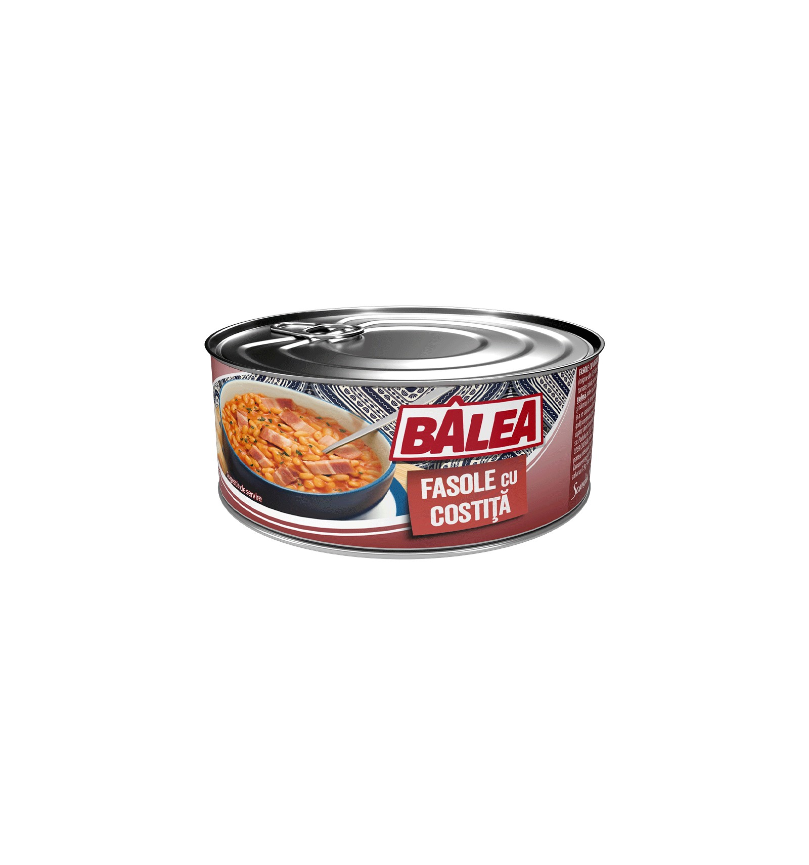 Ingrediente: apa, fasole alba boabe hidratata 34%, costita de porc 10%, pasta de tomate, zahar, faina alba de grau, sare iodata, morcovi, ulei de floarea soarelui, ceapa, boia de ardei, telina, ardei rosu, frunze patrunjel, piper, cimbru, aroma de fum, ulei de dafin.