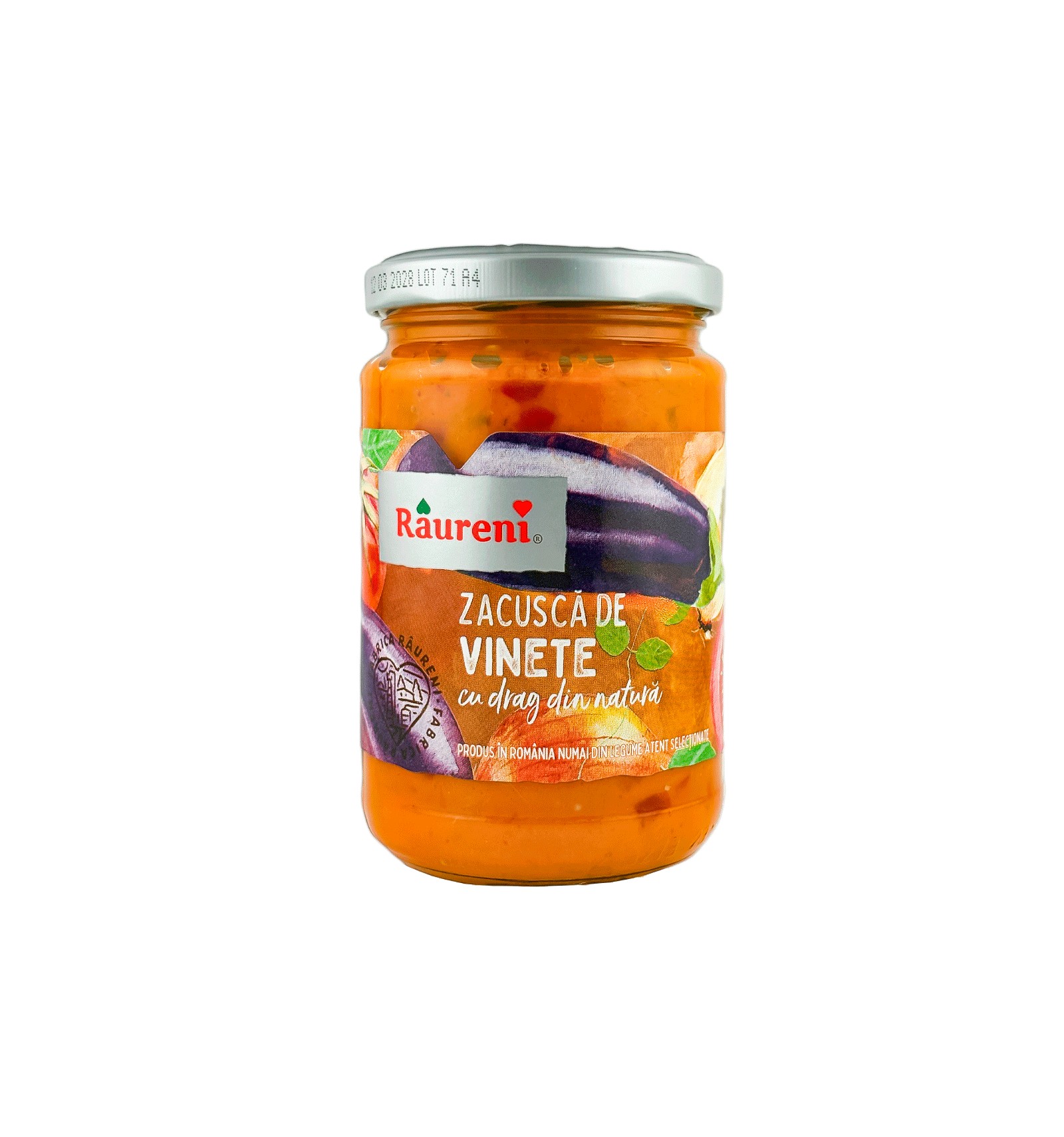 Ingrediente: Vinete coapte (40%), ardei capia copt, ceapa, pasta de tomate, ulei de floarea-soarelui, zahar, sare, piper, foi de dafin.