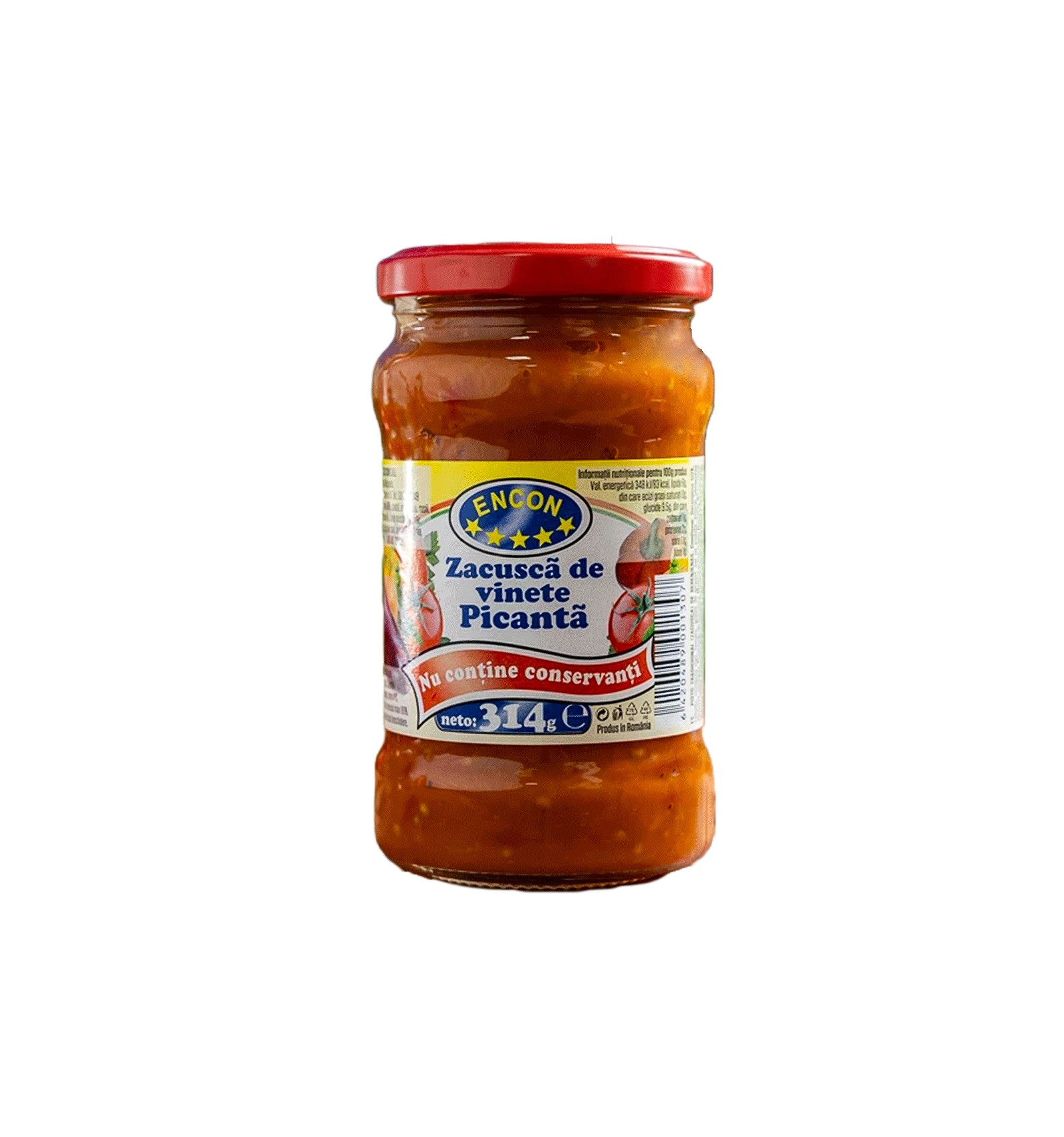 Ingrediente: vinete 60%, ceapă, ardei roșu, roșii, ulei de floarea soarelui, sare neiodată, zahăr, ardei iute, piper.