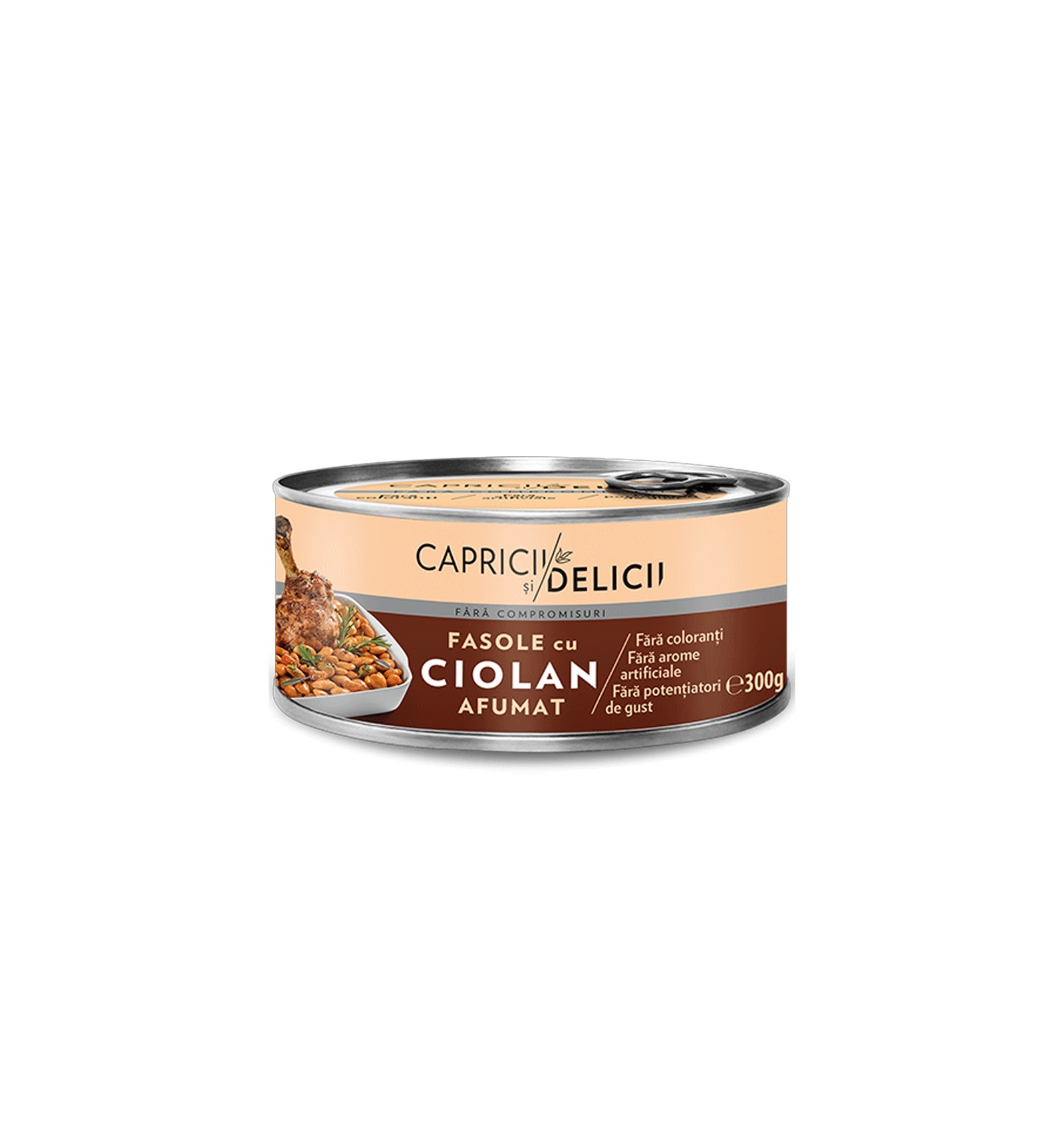 Ingrediente: apă, fasole albă boabe 36%, ciolan afumat 20% (ciolan de porc dezosat, sare, condimente naturale, fum natural), morcovi, ceapă, ardei, ulei vegetal nehidrogenat de floarea-soarelui, făină albă de GRÂU, pastă de tomate, sare iodată, slănină afumată, condimente naturale.