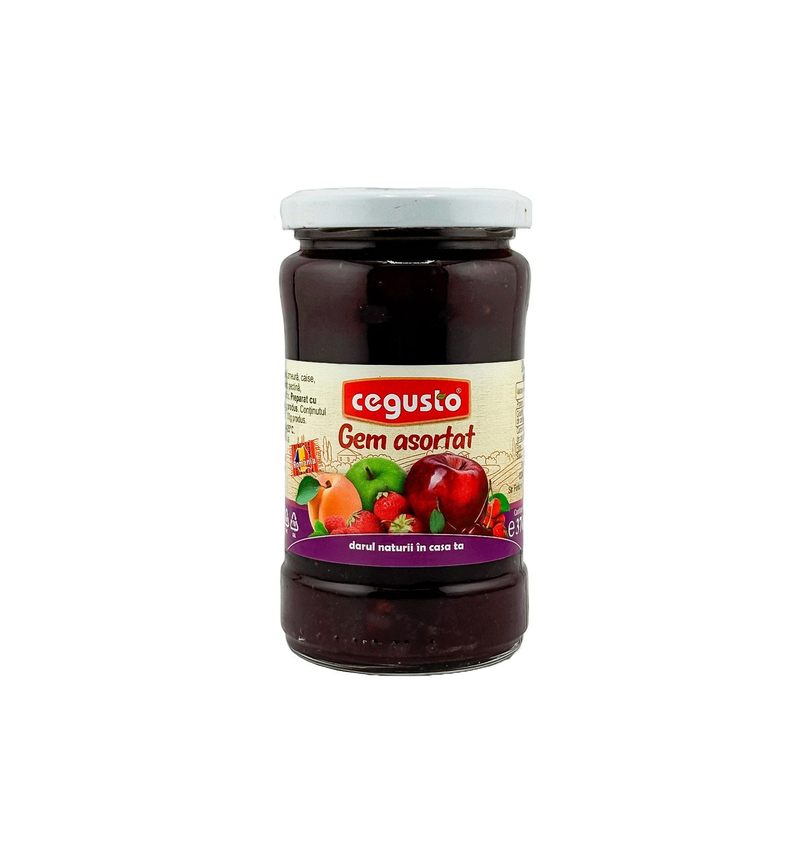 Ingrediente: visine, capsuni, zmeura, caise, mere, piersici, zahar, gelifiant: pectina, corector de aciditate: acid citric.