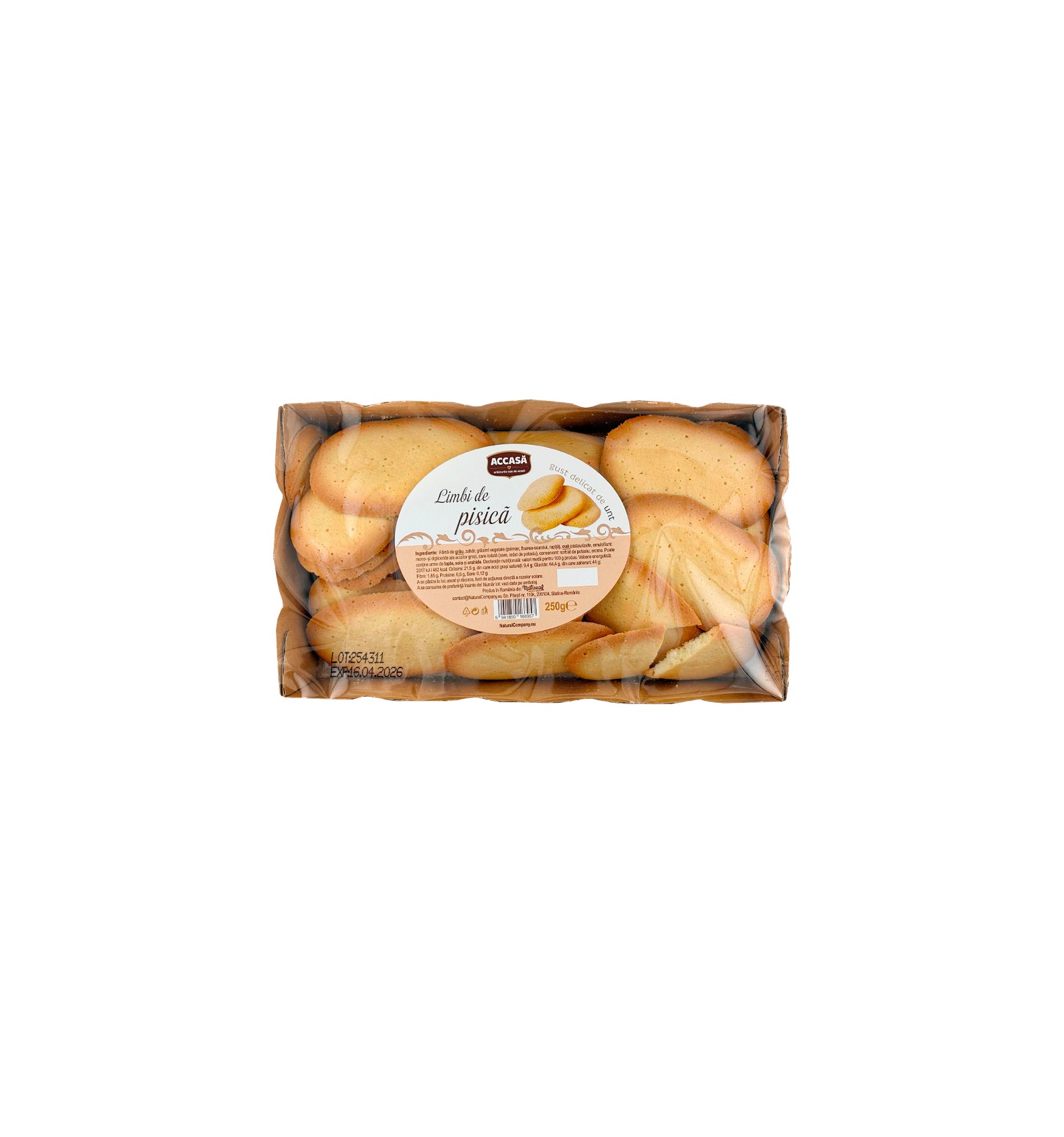 Ingrediente: faina de GRAU, zahar, grasimi vegetale (palmier, floarea soarelui, rapita), OUA pasteurizate, emulsifiant: mono- si digliceride ale acizilor grasi, sare iodata (sare, iodat de potasio), conservant: sorbat de potasio, arome. Poate contine urme de lapte, soia si arahide.