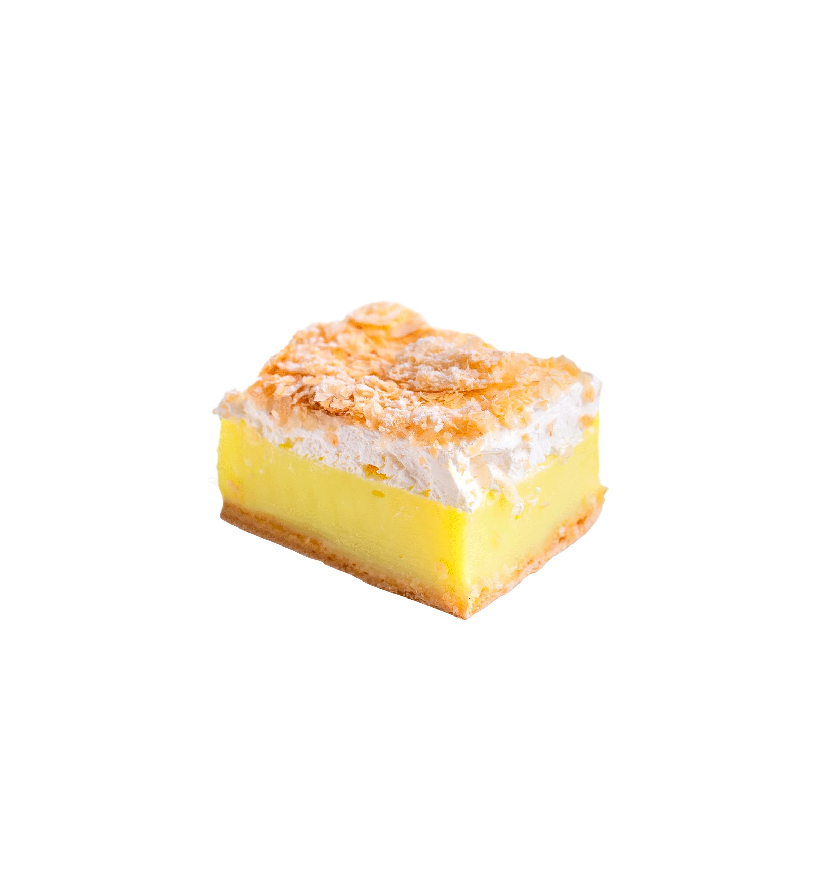 Ingrediente: cremă [apă, zahăr, lapte praf, amidon, cazeină, sirop de glucoză, grăsime vegetală hidrogenată (care conține emulgator lecitină de soia, E472), proteine din lapte, stabilizatori: E420, E460; sare iodată; coajă de lămâie]: crustă albă [făină de grâu 480, ouă, zahăr, ulei de floarea-soarelui, sirop de glucoză, emulgator: E471, agenți de afânare: E450, E500, smântână, cremă vegetală: apă, grăsime vegetală hidrogenată, zahăr, stabilizatori: E460, E466, E420; emulgatori: E472, E322; cazeinat de sodiu, arome, sare iodată], sirop (apă, zahăr, acidifiant: acid citric). Conține: ouă, gluten, soia, lactoză. Poate conține urme de arahide și fructe cu coajă lemnoasă.