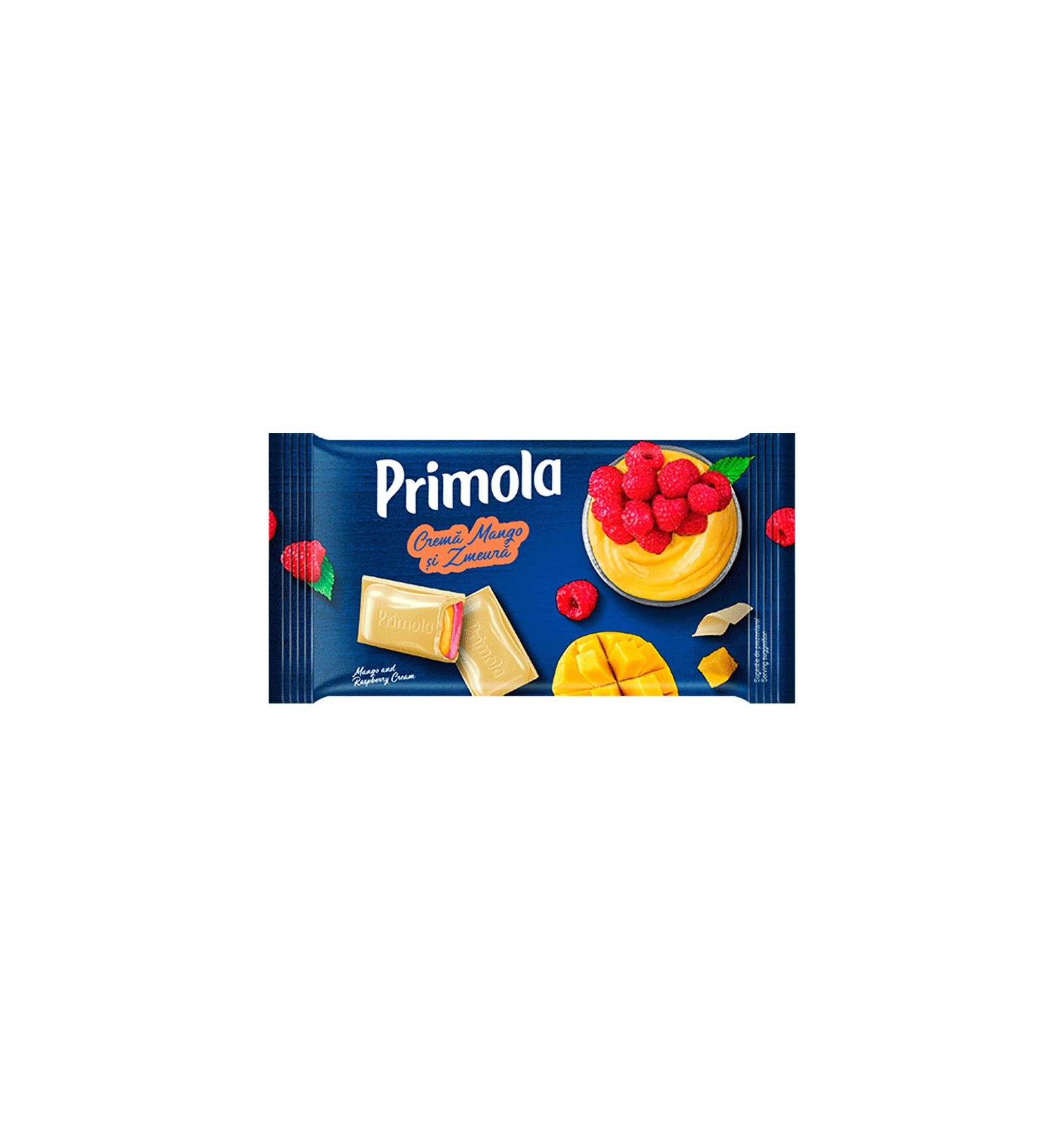 Ingrediente: zahăr, grăsimi vegetale (ulei de palmier, ulei de shea), unt de cacao, lapte praf integral, lapte praf degresat, pudră de zer (din lapte), grăsime din lapte, ulei de floarea-soarelui rafinat, pudră de mango 0,1% (sirop de glucoză, concentrat de piure de mango), pudră de zmeură 0,1% (concentrat de piure de zmeură, maltodextrină), acizi (acid lactic, acid citric), grăsimi vegetale (ulei de rapiță), emulgatori (lecitină de soia, poliglicerol poliricinoleat), coloranți (curcumină, carmin), arome. Ciocolata albă conține: solide de cacao 29% minim, solide de lapte 20% minim. Poate conține urme de arahide, nuci, gluten, ouă.