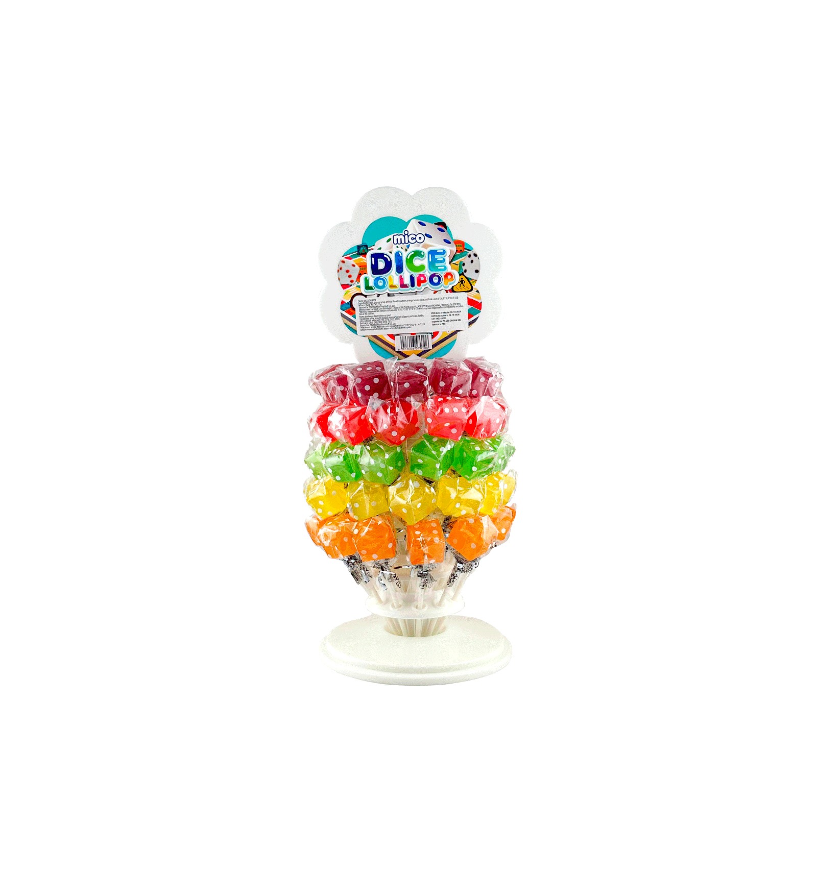 Ingrediente: zahăr, sirop de glucoză, aromă artificială (căpșună, portocală, lămâie, măr), acid citric, coloranți artificiali (E129, E110, E102, E133). Avertisment: aceste produse conțin coloranți artificiali (E102, E133, E110, E129), care pot afecta activitatea și atenția copiilor.