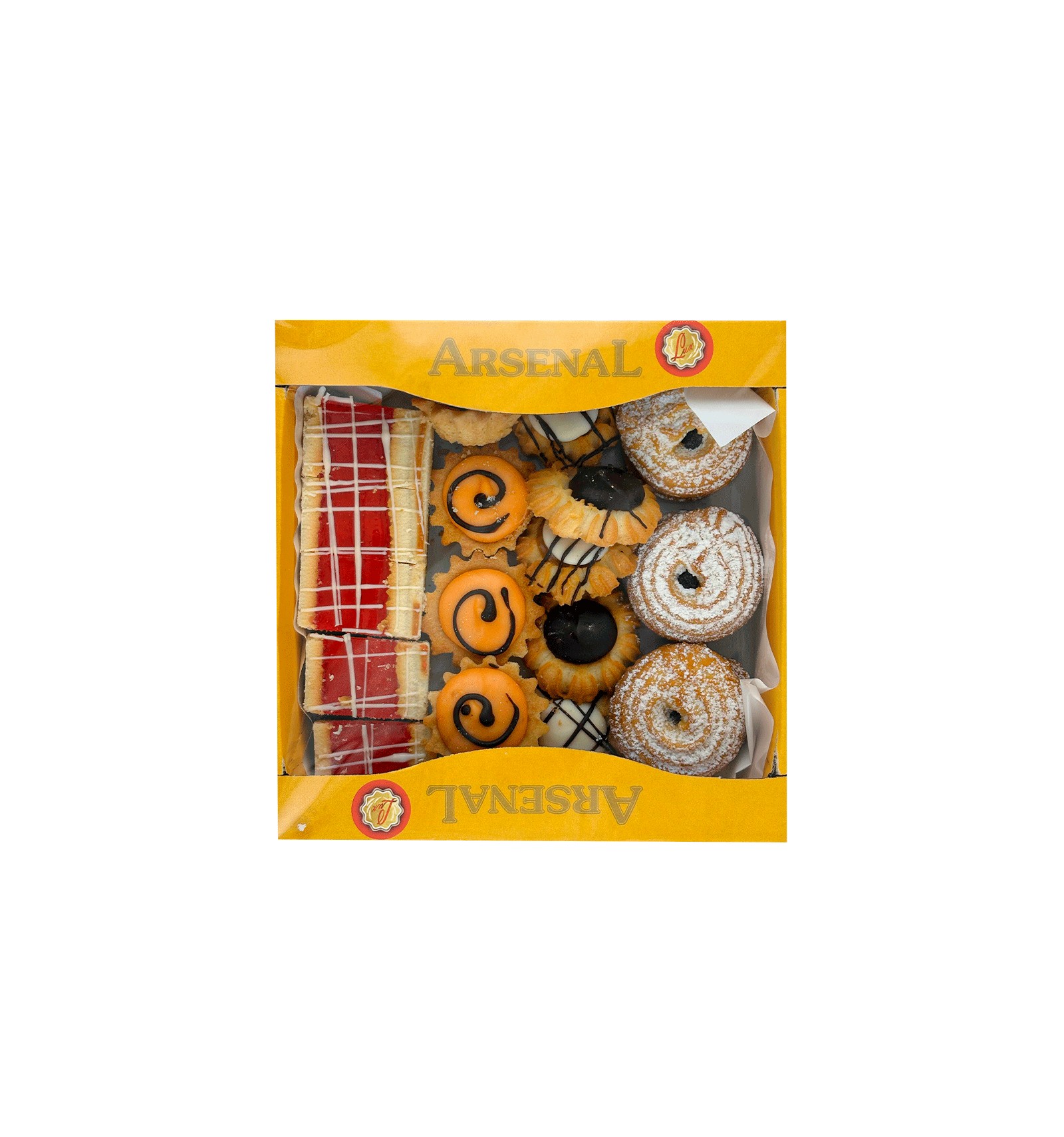 Ingrediente: Biscuit 48% [făină de GRÂU, margarină (uleiuri vegetale (palmier, ulei de rapiță), apă, emulgatori (mono și digliceride ale acizilor grași), sare, corector de aciditate (acid citric), conservant (sorbat de potasiu), colorant (annato), aromă), zahăr, zer de LAPTE praf, LAPTE (proteină din LAPTE), colorant (betacaroten extras), aromă], gel de căpșuni 10% [sirop de glucoză și fructoză, zahăr, apă, concentrat de căpșuni, pectină anhidrată, corector de aciditate (acid citric), aromă], colorant, conservant (sorbat de potasiu), aromă de coacăze 10% [sirop de glucoză și fructoză, apă, zahăr, suc de mere 1%, pectină anhidrată, corector de aciditate (acid citric), aromă, colorant (curcumină), conservant (sorbat de potasiu)], gel de portocale 10% [sirop de glucoză și fructoză, zahăr, apă mediu (glicerol), concentrat de portocale 1%, gelifiant (pectină anhidrată), corector de aciditate: acid citric], aromă, colorant (betacaroten extras), conservant (sorbat de potasiu), gem multifruct 7% [piure de mere, zahăr, piureuri de fructe (chokeberry, coacăze negre, căpșuni), corector de aciditate (acid citric), colorant (betanină), aromă, conservant (sorbat de potasiu)]. Glazură 7% [zahăr, grăsime vegetală (grăsimi vegetale parțial hidrogenate: ulei de palmier, ulei de rapiță, emulgator E492), cacao degresată, emulgator (lecitină de SOIA), conservant (sorbat de potasiu)], vafă 5% [făină de GRÂU, ulei de rapiță, emulgator (lecitină de SOIA), agent de afânare (carbonat de amoniu), zahăr, sare, smântână (zahăr, grăsime vegetală parțial hidrogenată: ulei de palmier și ulei de rapiță, emulgator E942), zer de LAPTE praf (proteină din LAPTE), aromă, emulgator (lecitină de SOIA), ARAHIDE 3%, cocos umplut glazurat (zahăr, apă, sirop de porumb)].