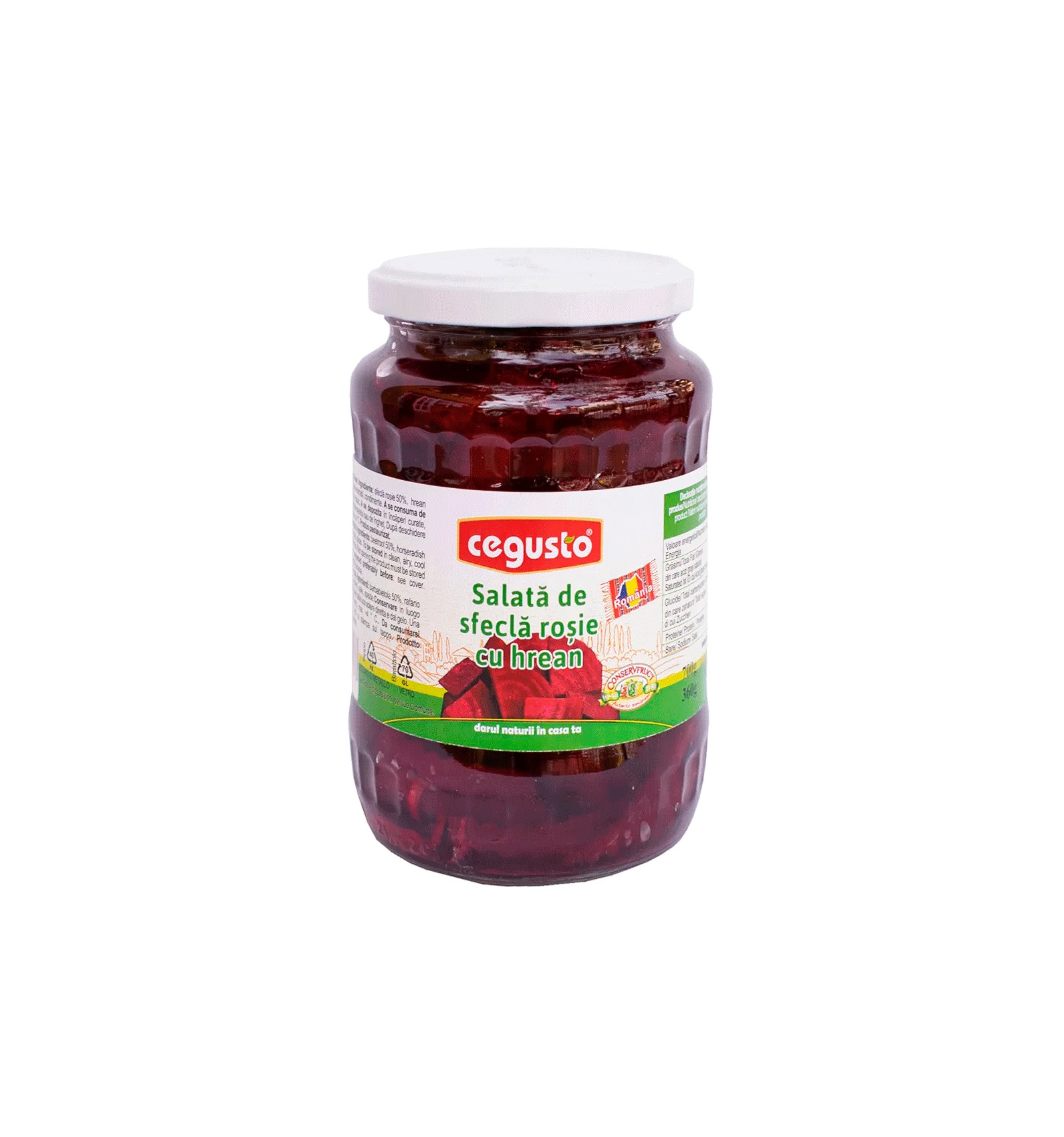 Ingrediente: sfecla rosie 50%, hrean 1%, acid acetic diluat, zahar, sare neiodata, condimente.