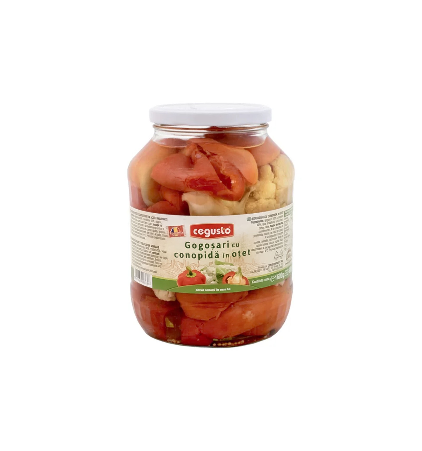 Ingrediente: gogosari 31%, conopida 20%, acid acetic diluat, zahar, sare neiodata, boabe de mustar, condimente.