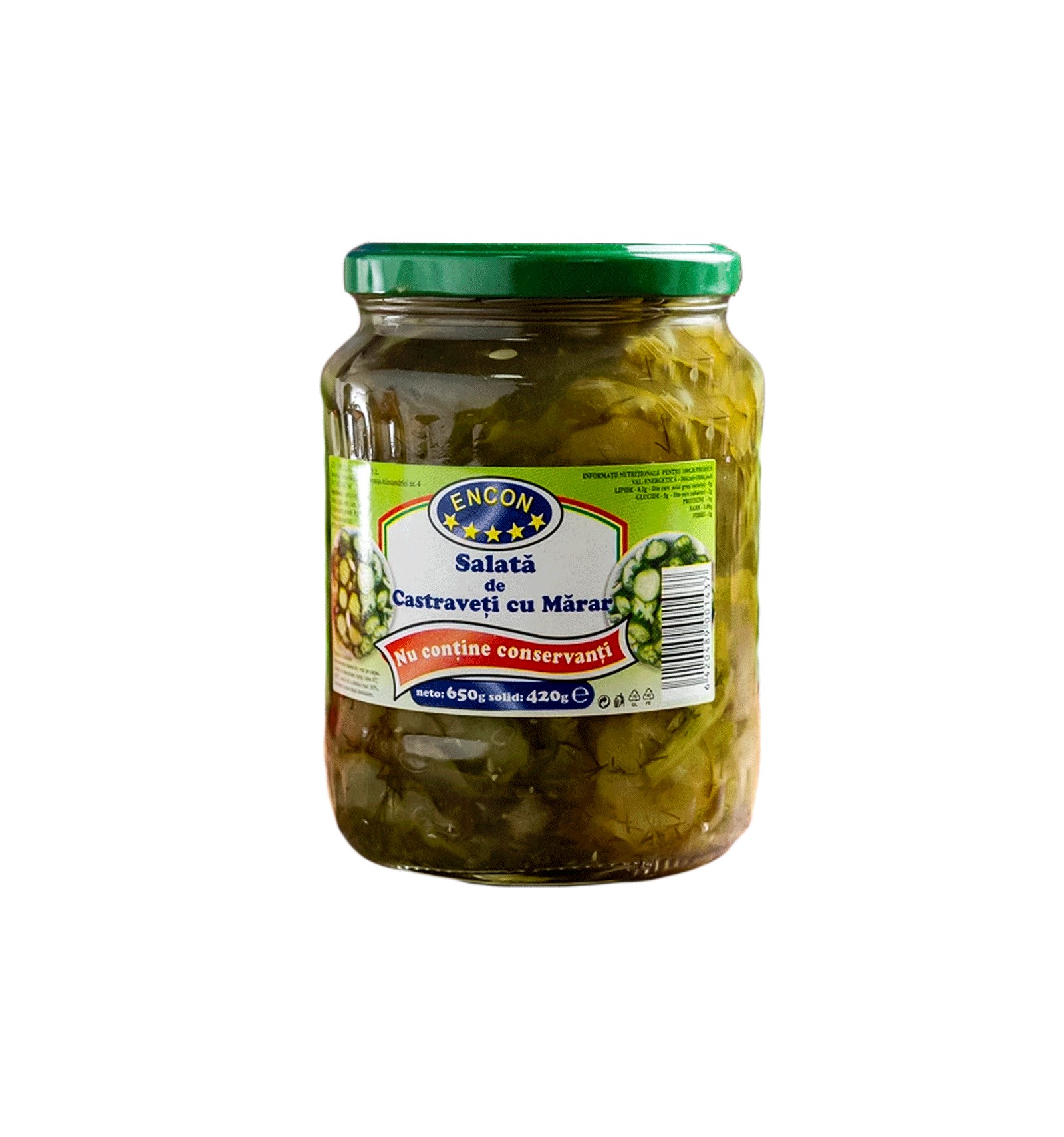 Ingrediente: castravete, mărar, usturoi, apă, oțet, sare, zahăr.