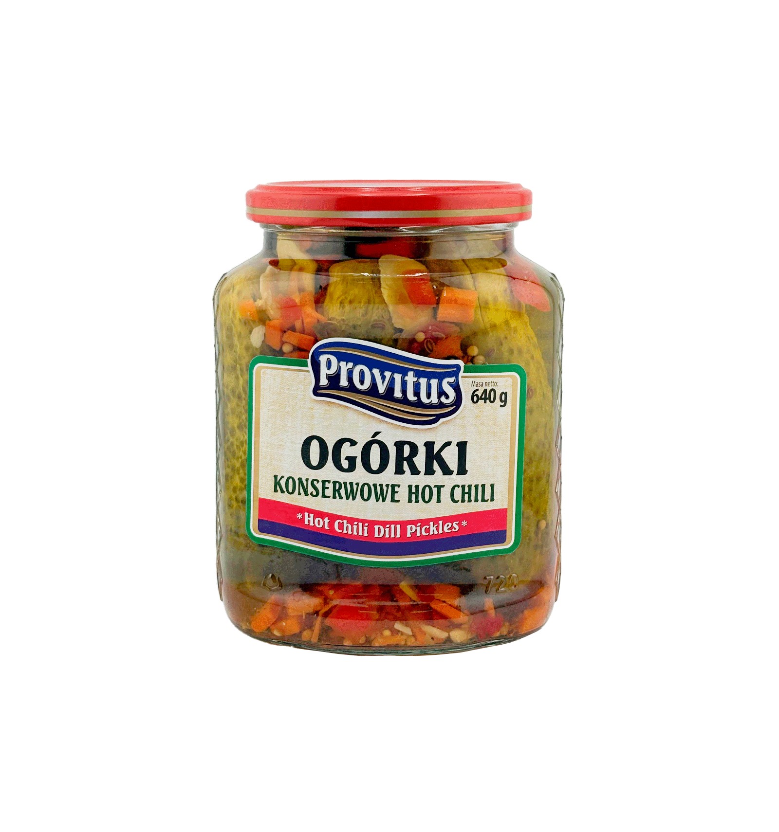 Ingrediente: castraveți (48%), apă, oțet din alcool, zahăr, mărar, sare, legume (ceapă, morcov, ardei, usturoi), MUȘTAR, amestec de condimente, ardei CHILI (0,1%), colorant: riboflavină.