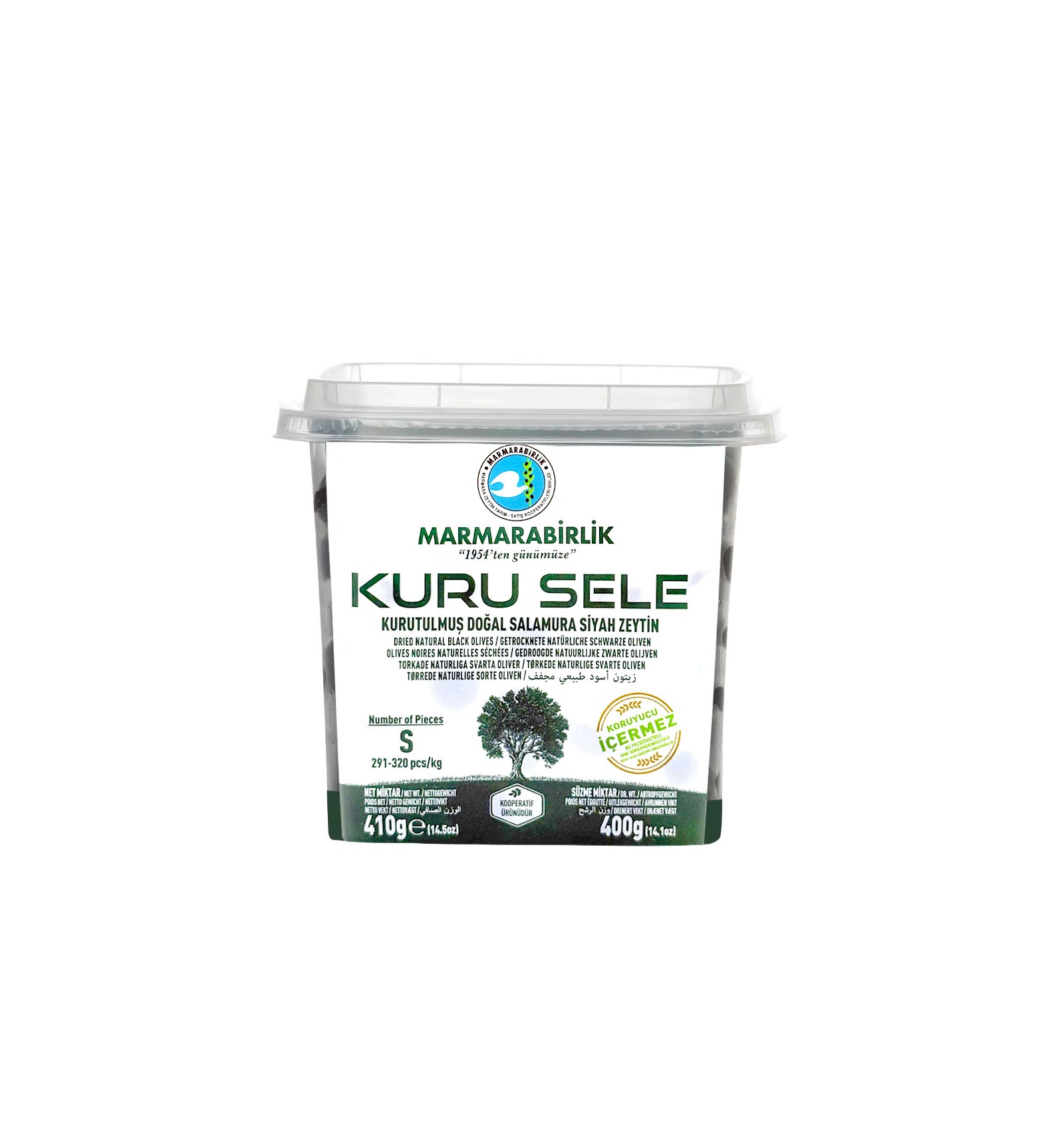 Ingrediente: masline negre gemlik 90.9%, sare 5.5%, ulei de porumb 2.5%, regulator de aciditate: acid lactic, agent de ingrosare: clorura de calciu. Poate contine fragmente de samburi.