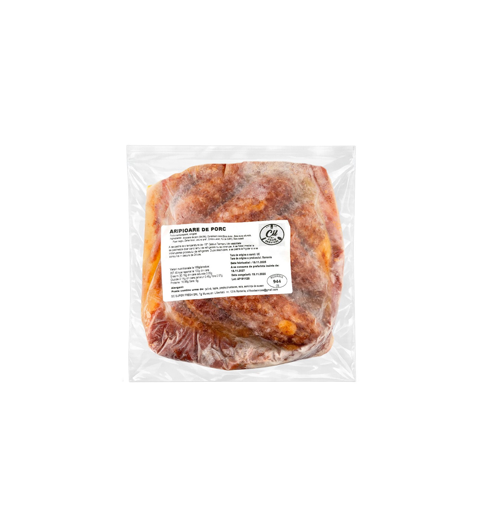 Ingrediente: aripioare de porc 94.4%, condiment ciolan (boia dulce afumata, piper negru, zahar brun, usturoi praf, cimbru uscat, foi de dafin), sare iodata. Poate contine urme de: TELINA, LAPTE, PESTE, CRUSTACEE, SOIA, SEMINTE DE SUSAN.